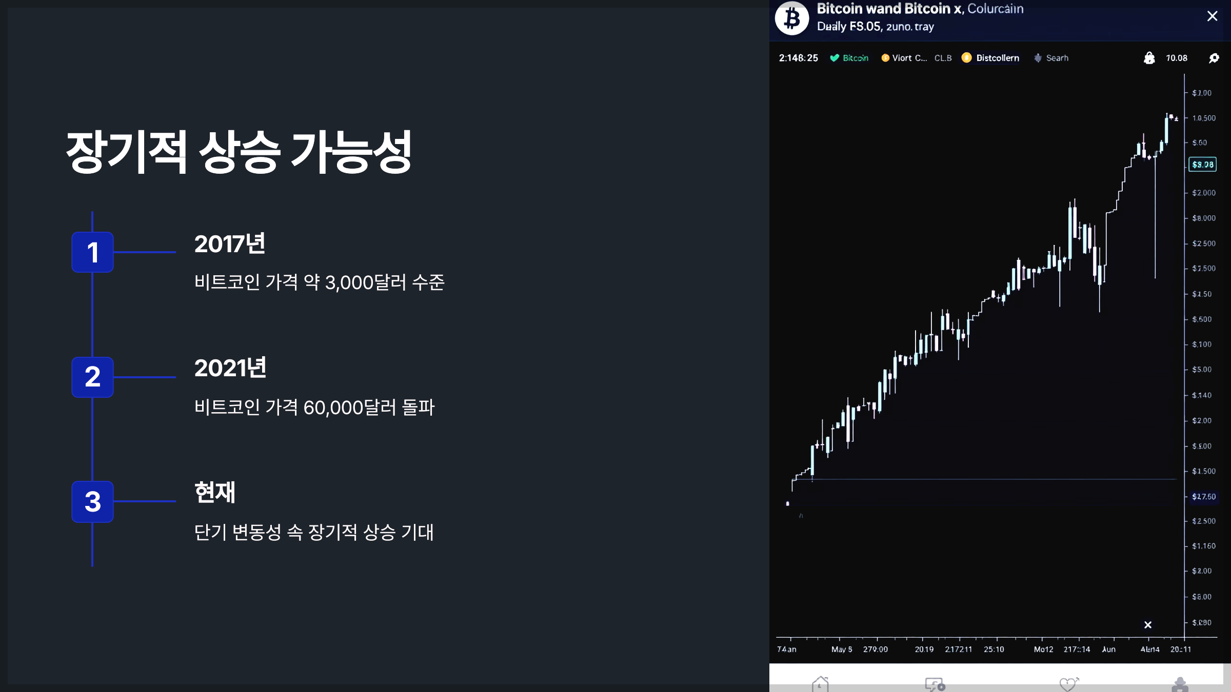비트코인은 단기적으로 변동성이 크지만, 장기적으로는 꾸준히 상승해 왔습니다. 예를 들어, 제가 2017년에 비트코인에 투자했을 때 가격은 약 3,000달러 수준이었습니다. 당시 비트코인에 대한 대중의 인식은 지금보다 훨씬 낮았고, 많은 사람이 회의적이었습니다. 그러나 2021년에는 비트코인이 60,000달러를 넘어서며 엄청난 상승을 보여주었습니다. 물론 2018년의 급락 기와 2022년의 조정기 등 큰 하락을 겪기도 했습니다. 하지만 비트코인을 꾸준히 보유하며 장기적인 상승 가능성을 믿었습니다. 2021년 고점 근처에서 투자해 손해를 본 적도 있었지만, 그 후에도 비트코인을 계속 보유하고 있으며, 장기적 상승 가능성을 믿고 있습니다. 단기적인 가격 변동에 흔들리기보다는 큰 그림을 보는 것이 중요하다고 생각합니다.
