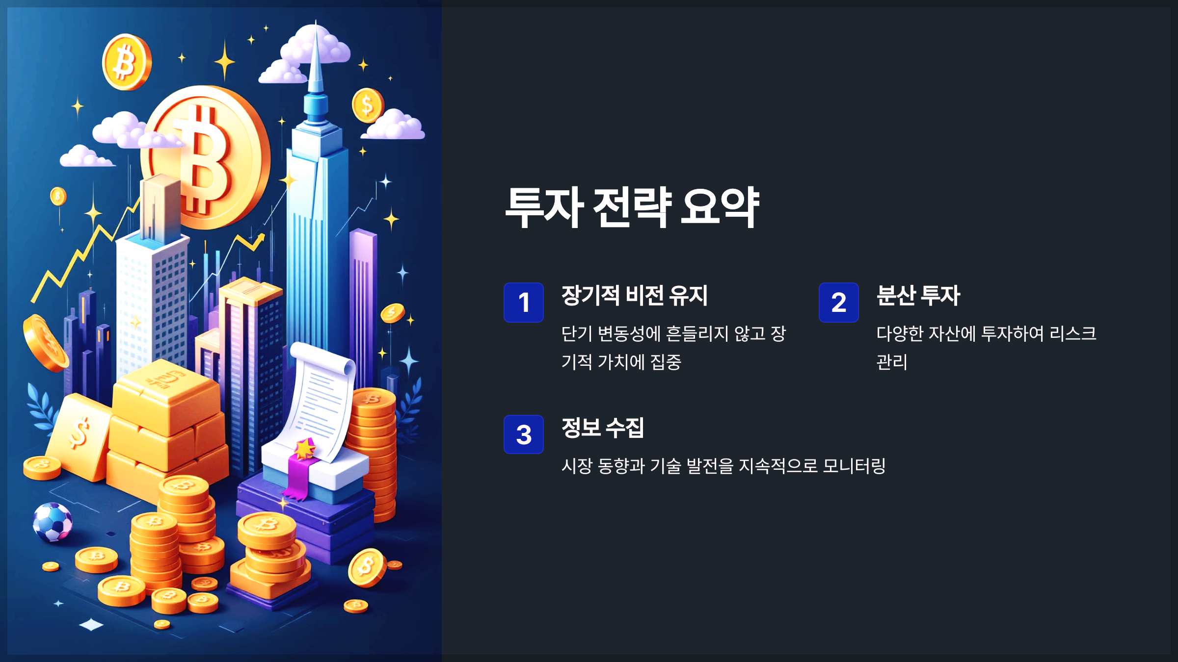 결론적으로, 비트코인의 미래는 여전히 큰 가능성을 지니고 있으며, 그 여정 또한 매우 흥미로울 것입니다. 그러나 장기적 비전을 갖되, 변화에 유연하게 대처할 수 있는 준비도 필요합니다. 시장의 상승과 하락을 모두 경험하며, 자신의 투자 원칙을 지키고 개선해 나간다면, 우리는 비트코인이 열어갈 새로운 가능성의 시대를 현명하게 맞이할 수 있을 것입니다. 함께 이 여정을 즐기며, 현명한 투자 결정을 내리기를 기원합니다.