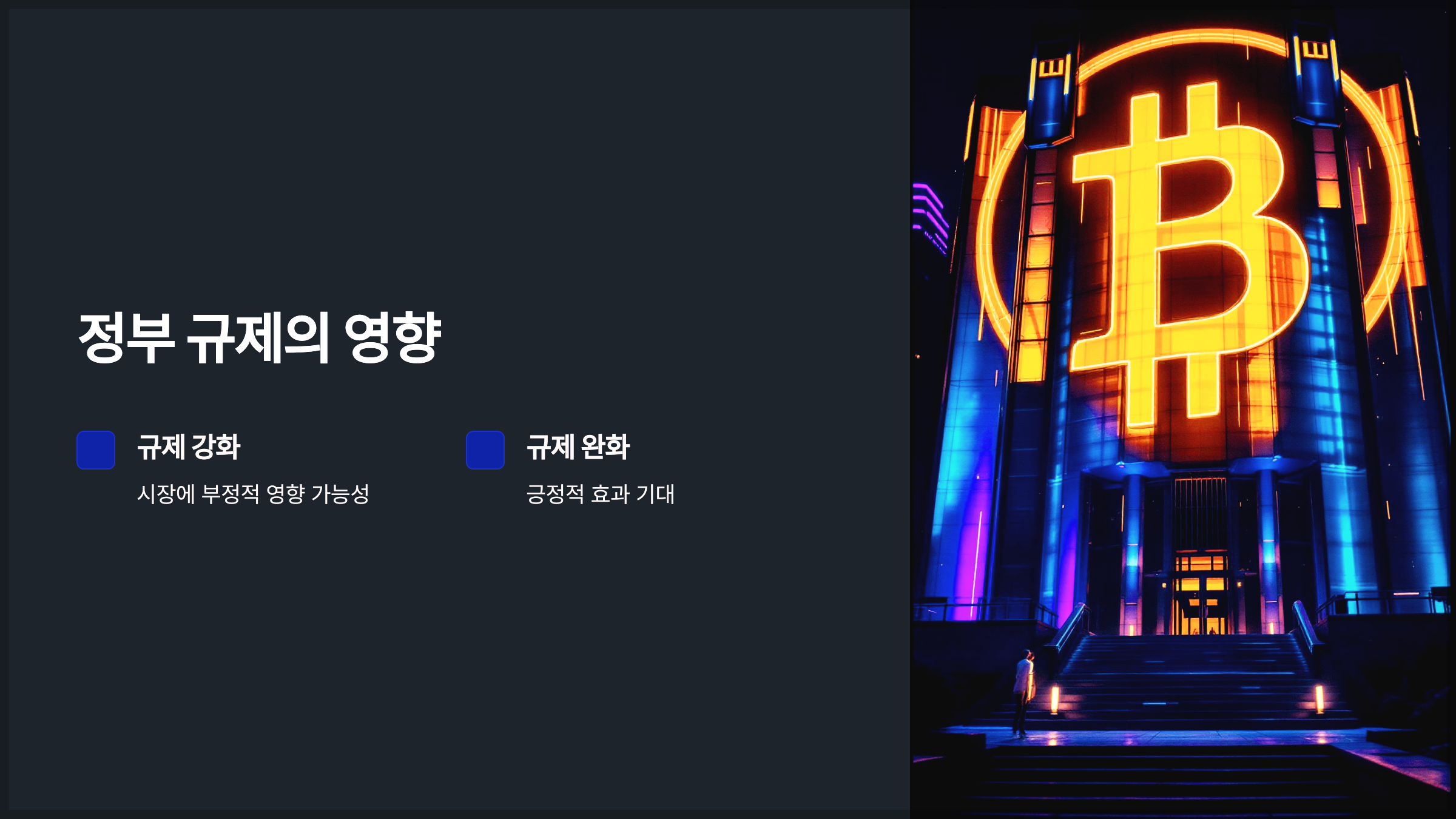 각국 정부의 암호화폐를 규제하는 정책이 큰 영향을 미칩니다. 규제가 강화되면 시장에 부정적인 영향을 줄 수 있고, 반대로 규제가 완화되면 긍정적인 효과를 가져올 수 있습니다.