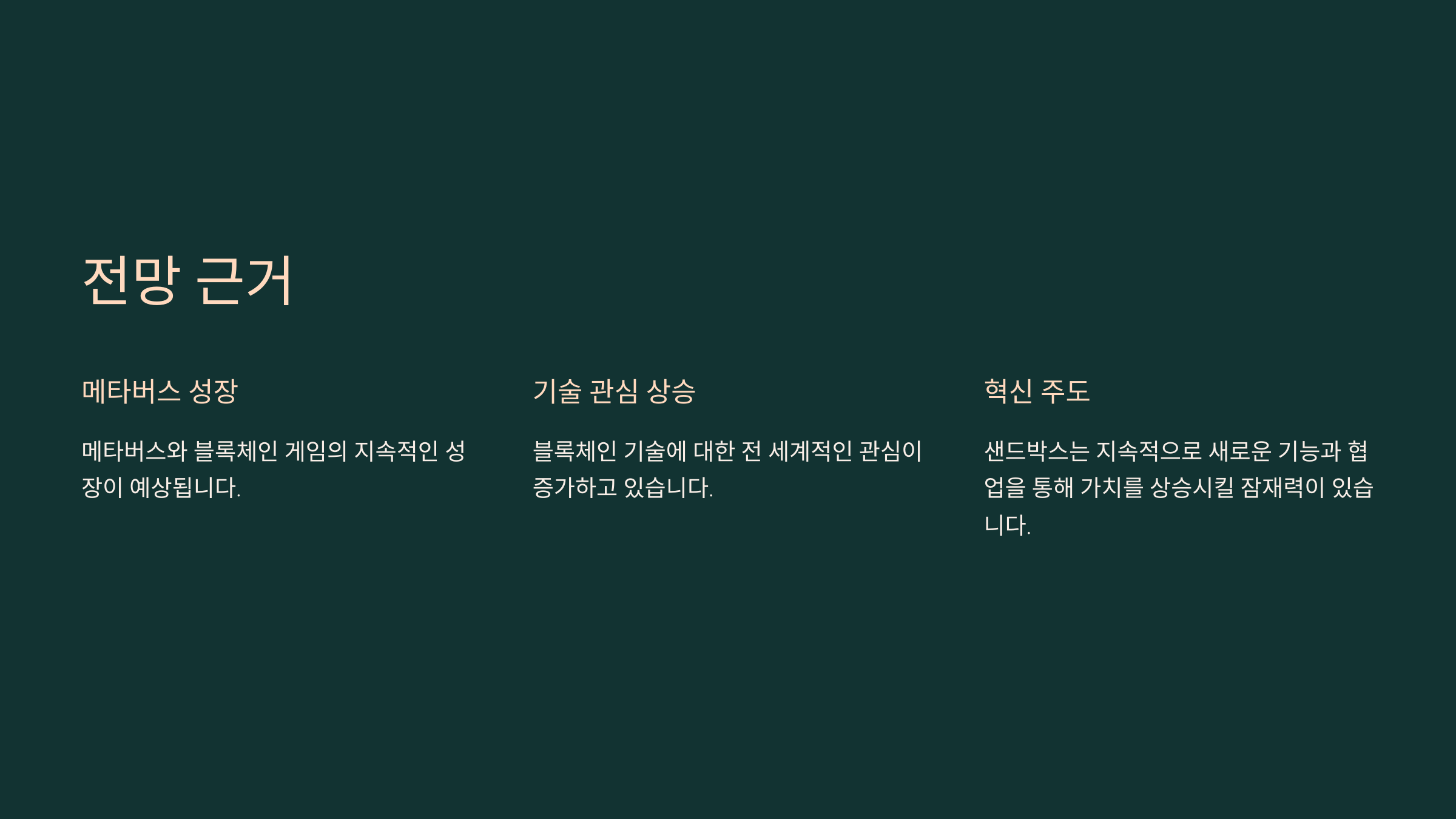 이러한 전망은 메타버스와 블록체인 게임의 지속적인 성장, 그리고 블록체인 기술에 대한 전 세계적인 관심 상승에 기반하고 있습니다. 샌드박스는 이러한 기술 발전의 중심에서 혁신을 이끌며, 지속적으로 새로운 기능과 협업을 통해 가치를 상승시킬 잠재력이 있습니다.