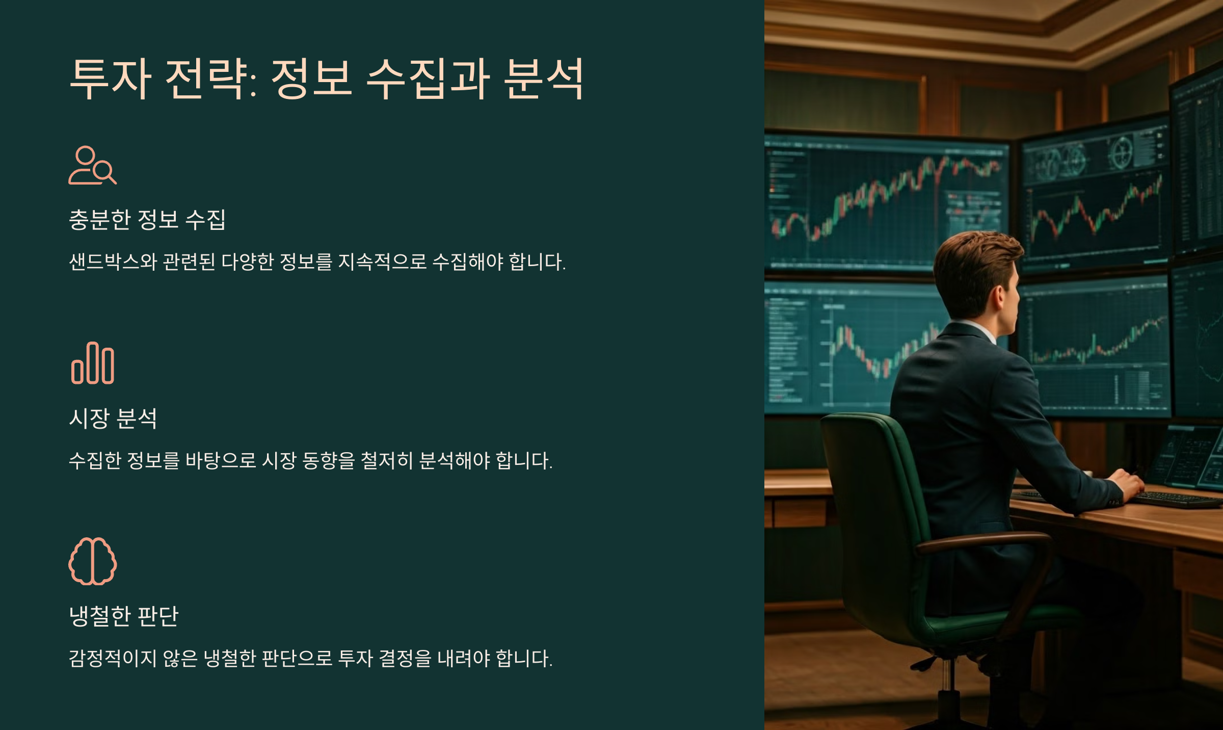 저의 경험에 비추어 보았을 때, 샌드박스와 같은 프로젝트에 투자할 때는 항상 변화에 대비하고 장기적인 비전을 갖는 것이 성공의 열쇠였습니다. 시장의 흐름을 지속적으로 파악하고 자신의 리스크를 관리하며, 혁신적인 기술과 플랫폼이 만들어낼 미래의 가능성을 신뢰하는 태도가 중요합니다.