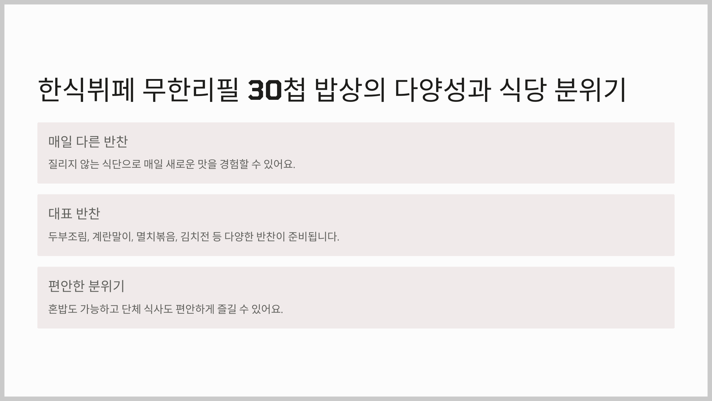 | 반찬 구성 | 매일 달라짐, 평균 30종 이상 제공 |