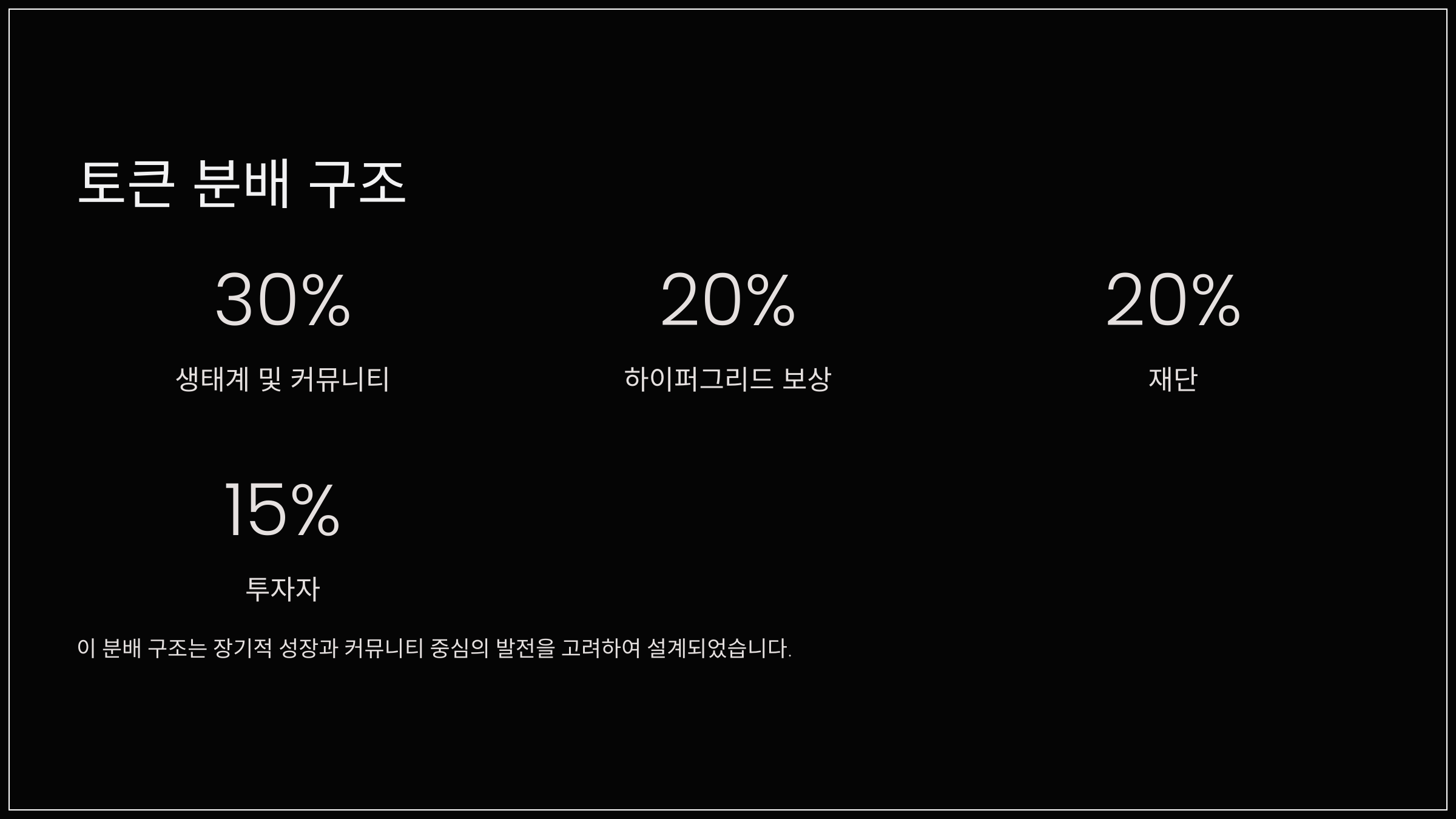 이러한 분배 구조는 장기적인 성장과 커뮤니티 중심의 발전을 고려한 것으로, 당신과 같은 참여자가 더 많은 혜택을 누릴 수 있도록 설계되었습니다.