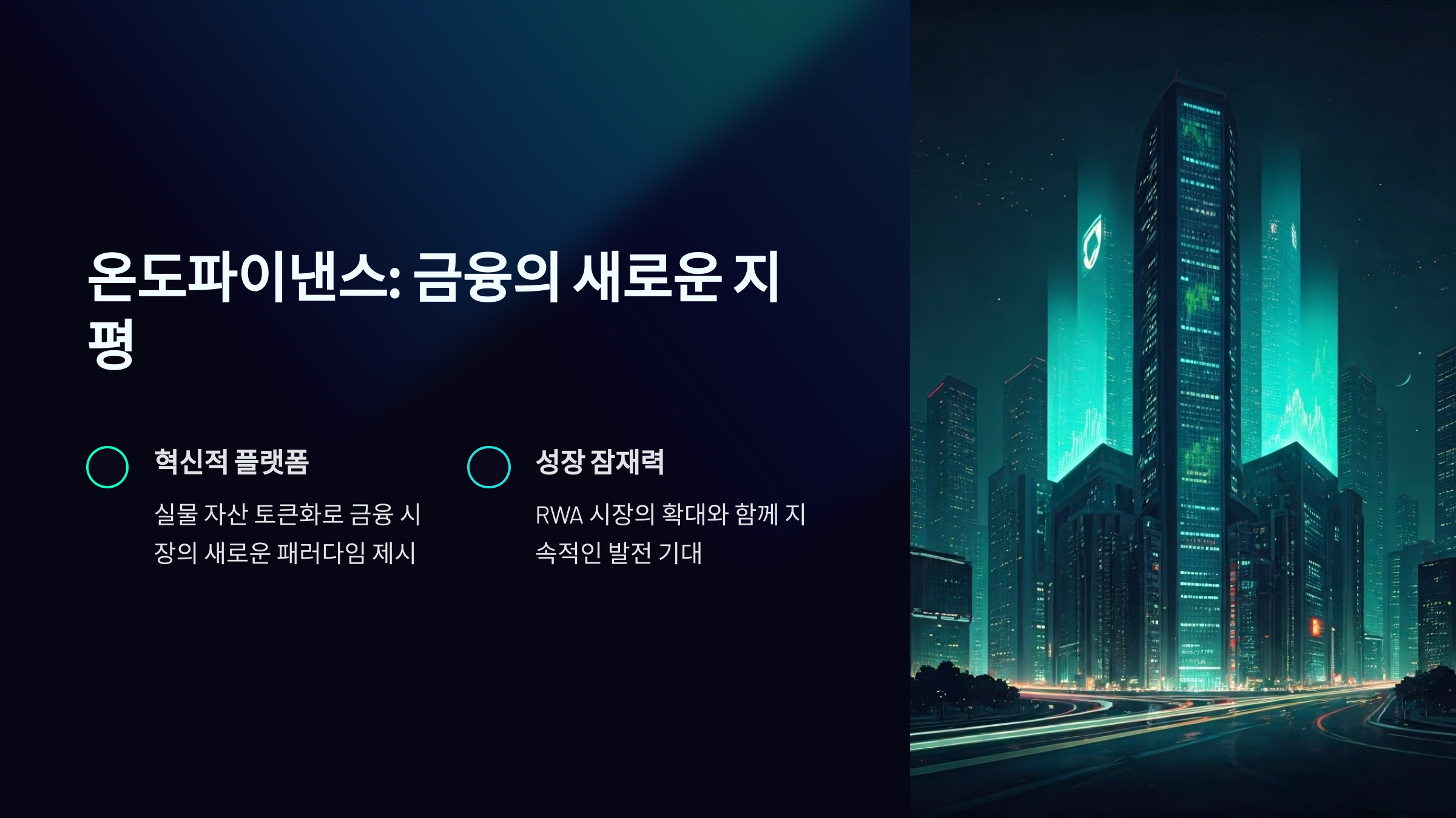 온도파이낸스는 RWA(실물 자산 토큰화) 시장의 중심에서 빠르게 성장하고 있습니다. 전문가들은 RWA 시장이 2025년까지 1조 달러 규모로 확대될 것으로 예상하며, 온도파이낸스는 이러한 성장의 중심에 있을 것으로 기대됩니다. 이러한 전망은 온도파이낸스가 장기적으로 큰 성장 잠재력을 지니고 있음을 시사합니다. 제 개인적인 경험으로도, 온도파이낸스를 통한 실물 자산 투자와 관리가 상당히 효율적이었으며, 이 같은 효율성 덕분에 장기적인 성장 가능성을 확신하게 되었습니다.