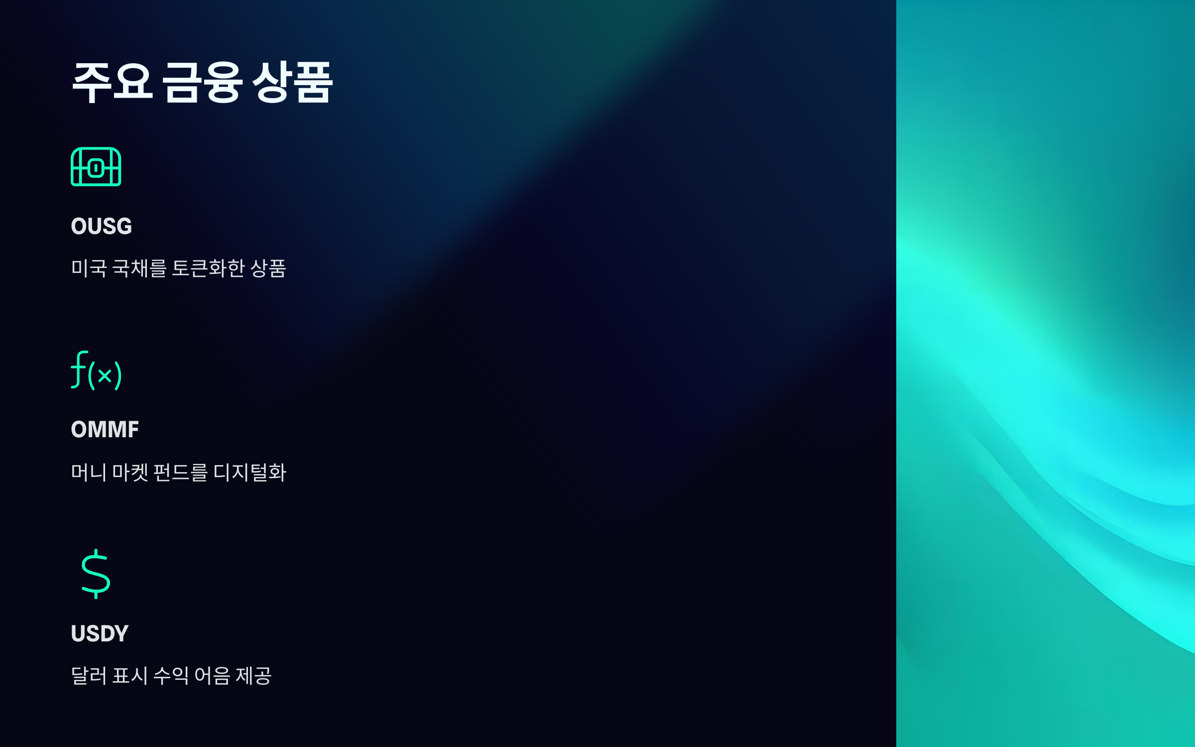 온도파이낸스의 특징은 실물 자산의 토큰화입니다. OUSG(미국 국채), OMMF(머니 마켓 펀드), USDY(달러 표시 수익 어음) 등 다양한 금융 상품을 디지털 자산으로 변환하여 투자자들에게 제공합니다. 실제로, 온도파이낸스를 통해 OUSG에 투자한 경험이 있는데, 블록체인 기술 덕분에 투자 과정이 매우 간단하고 투명했습니다. 이러한 상품들은 전통적인 금융 기관을 통한 거래보다 빠르고 간편하며, 블록체인 기반의 투명성을 통해 거래의 신뢰성을 확보할 수 있습니다.