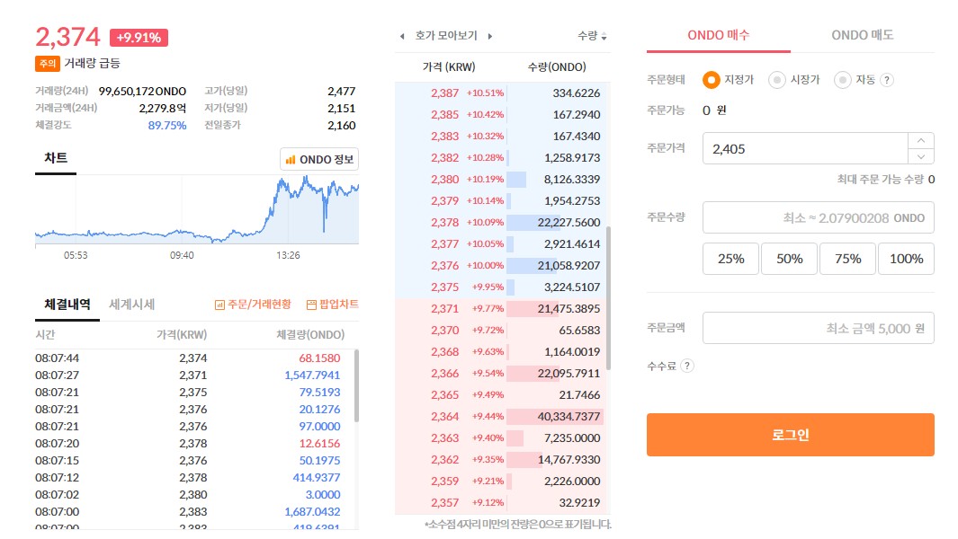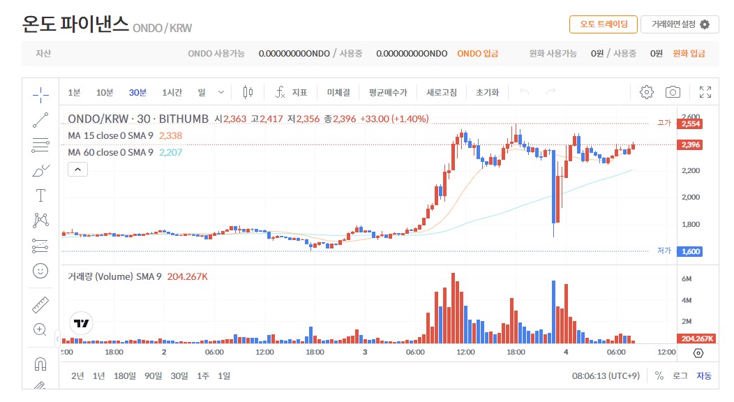 온도파이낸스 코인(ONDO)은 2023년 6월 업비트에 상장되었으며, 당시 약 170원으로 거래를 시작해 꾸준한 상승세를 보였습니다. 2024년 11월 기준, ONDO 코인의 평균 시세는 약 1,500원으로, 시가총액은 약 2조 344억 원에 달하고 있습니다.