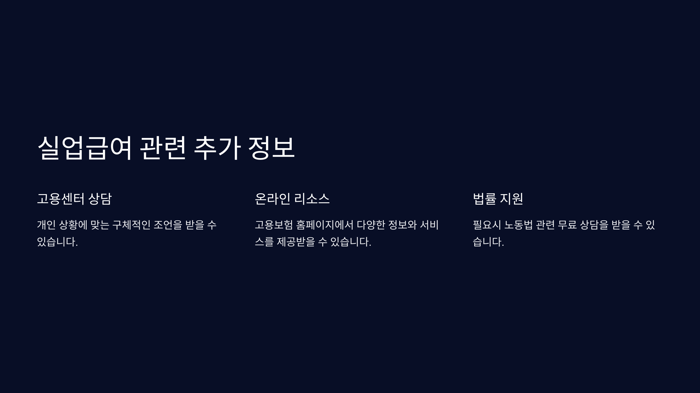 실업급여는 단순한 경제적 지원을 넘어, 새로운 직장을 찾기 위한 중요한 발판이 되어줍니다. 계약직이든 정규직이든, 이 제도를 잘 활용하면 경제적 부담을 덜고 구직 활동에 전념할 수 있습니다. 저 역시 실업급여 덕분에 새로운 기회를 준비하며 제 경력을 발전시킬 수 있었습니다. 실업급여에 대해 더 궁금한 점이 있다면 언제든지 고용센터나 고용보험 홈페이지를 통해 자세한 정보를 확인해 보세요. 새로운 시작을 준비하는 모든 분을 진심으로 응원합니다. 여러분의 노력과 결실이 함께 하길 바랍니다!