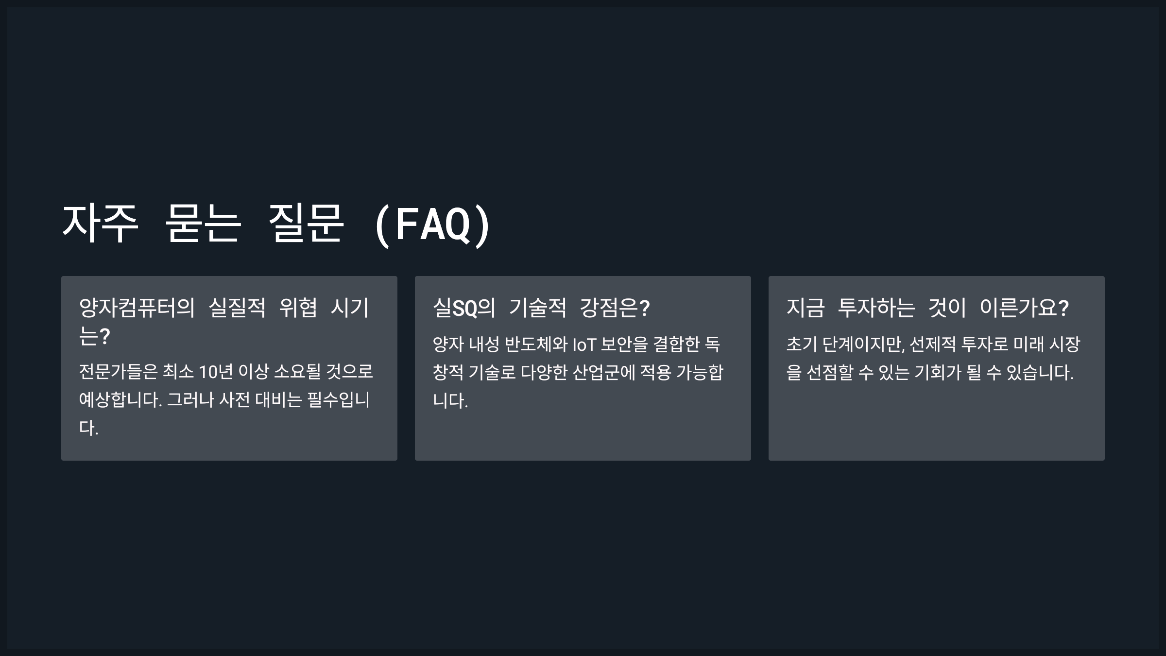 - A: 실SQ는 양자 내성 반도체와 IoT 보안을 결합한 독창적인 기술로 다양한 산업군에서 활용 가능한 보안 솔루션을 제공합니다.