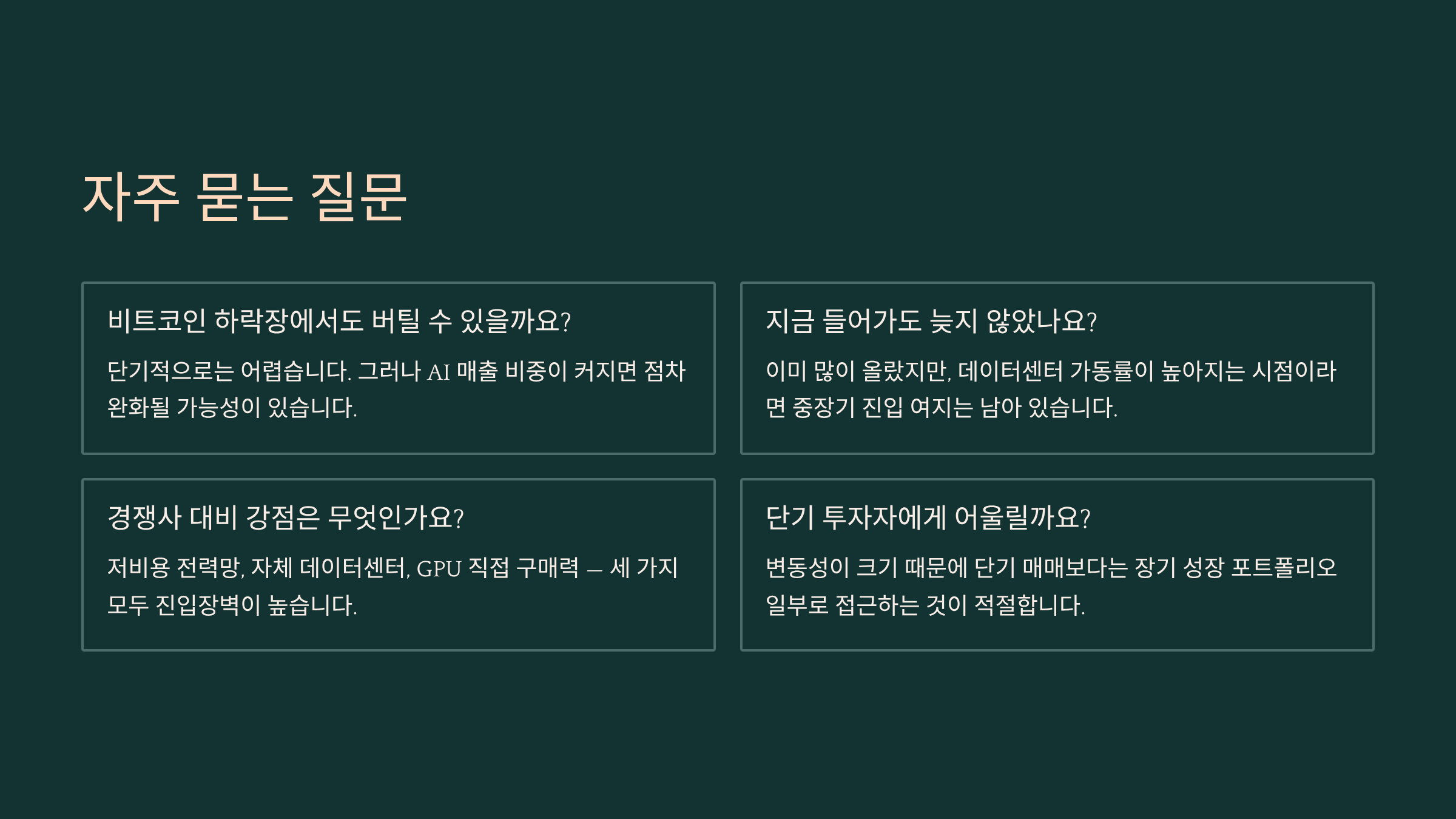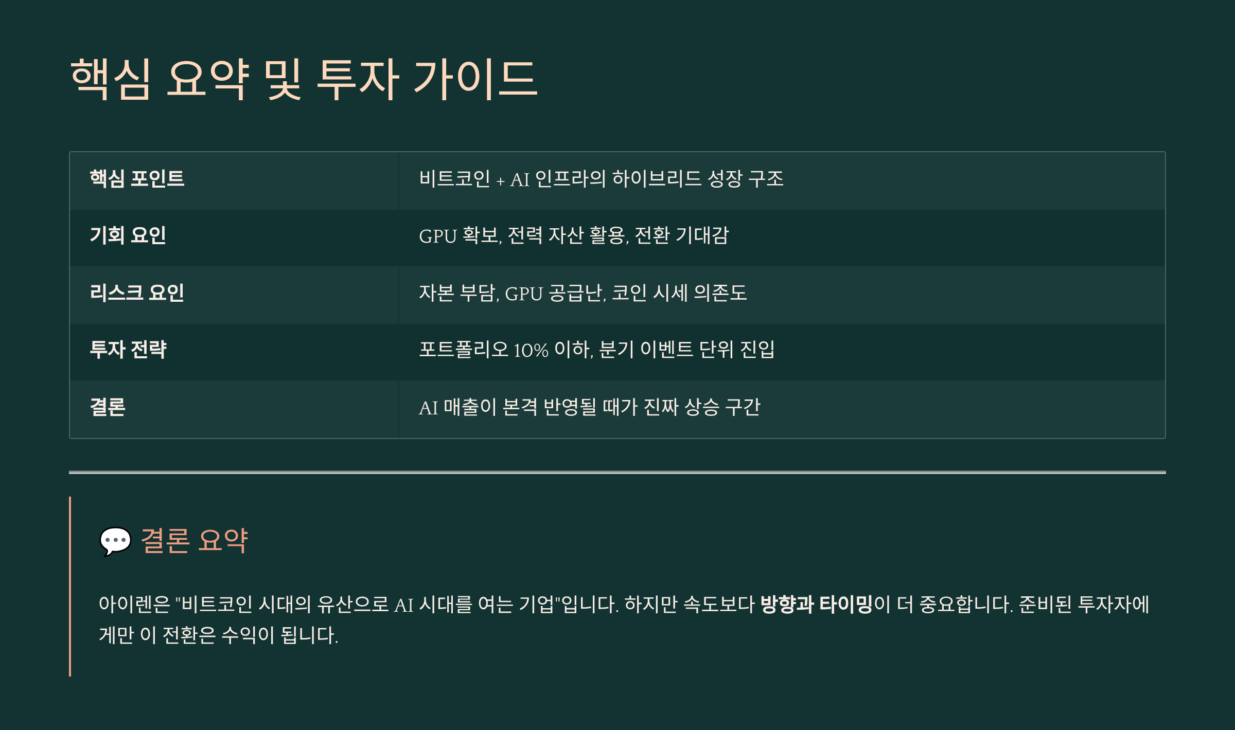 | 핵심 포인트 | 비트코인 + AI 인프라의 하이브리드 성장 구조 |