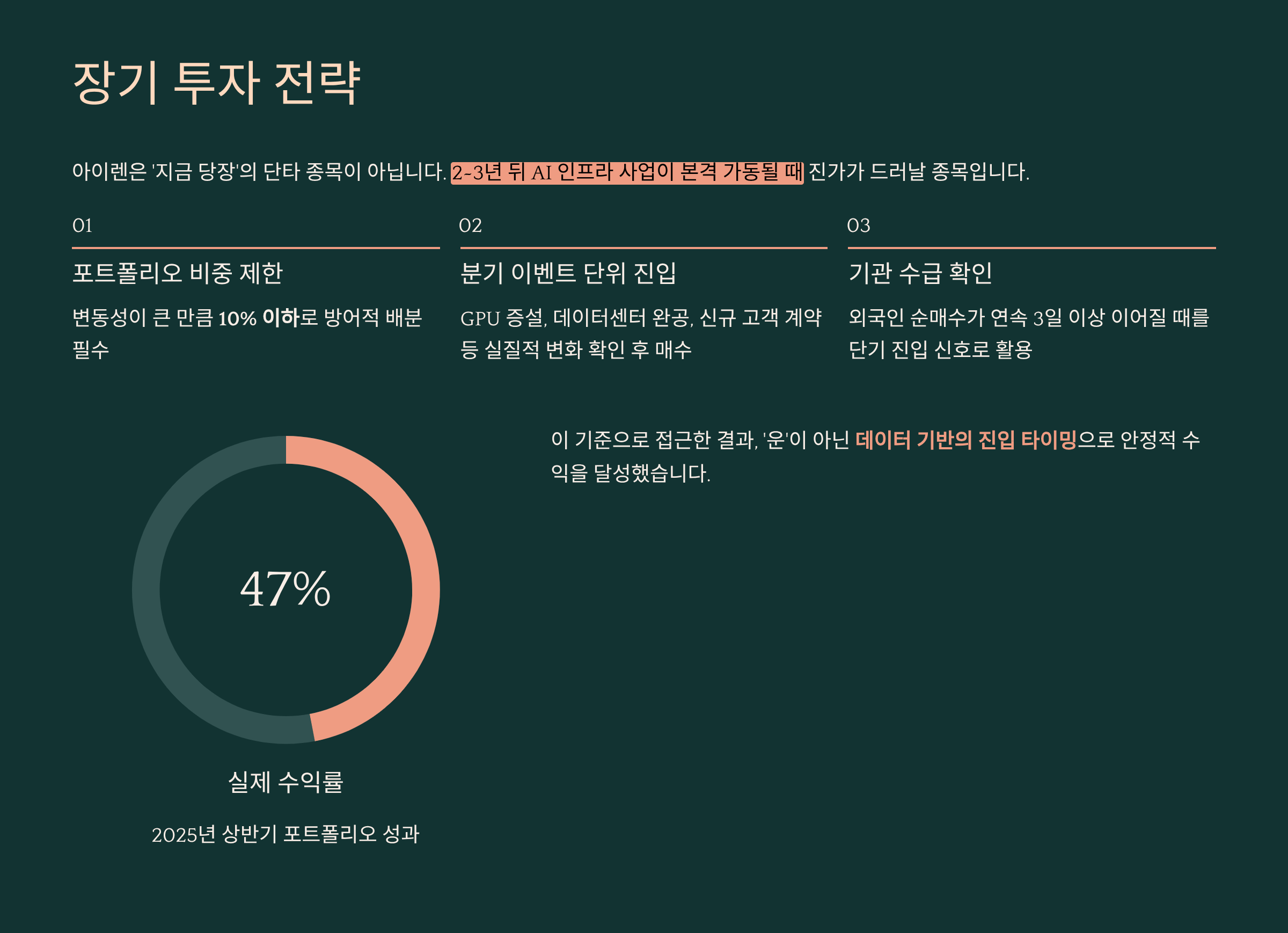 저는 아이렌을 단기 매매가 아닌 ‘AI 인프라 전환 투자’로 접근했습니다.