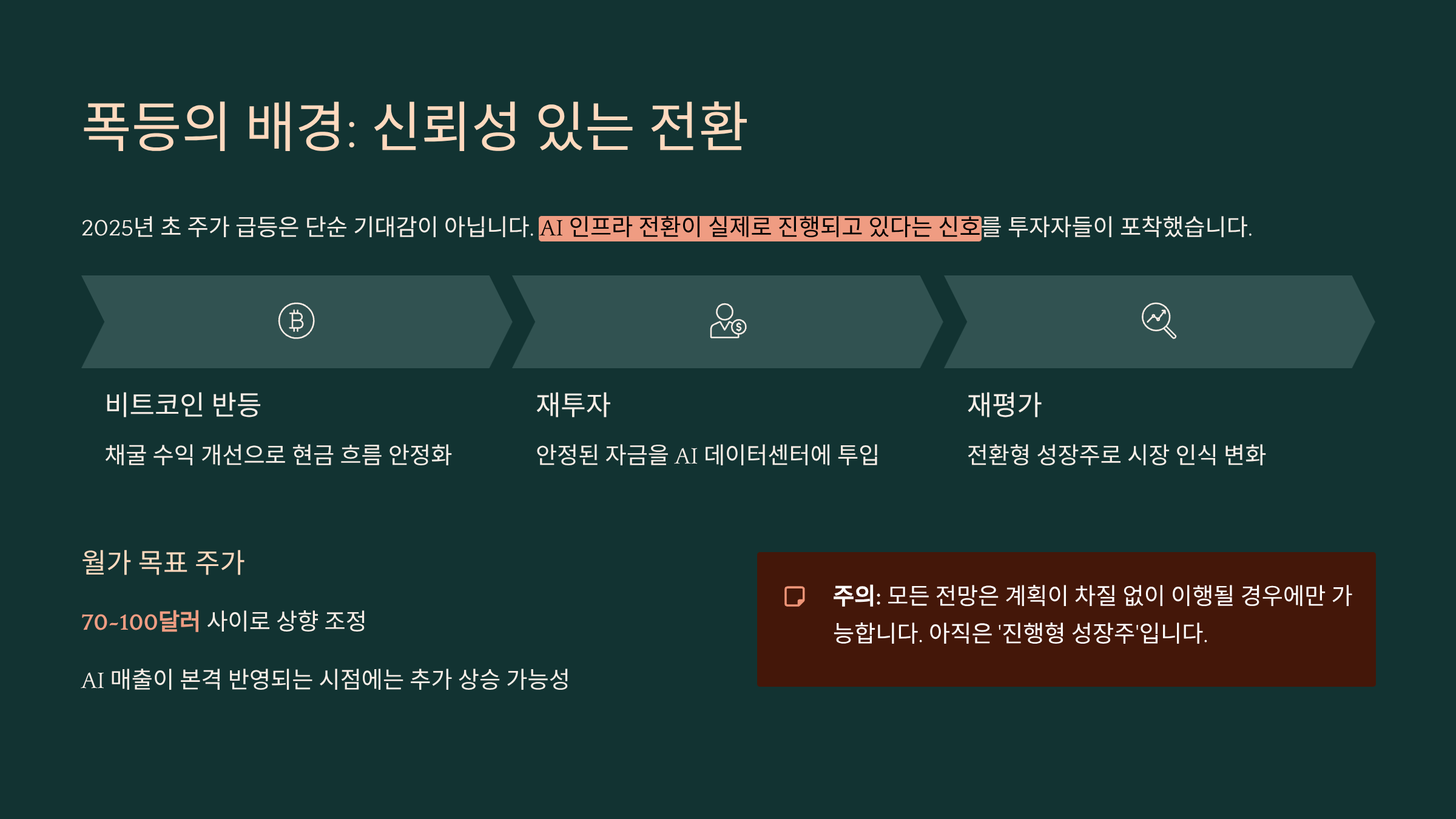 비트코인 채굴기업이었던 이 회사가 AI 데이터센터 기업으로 변신하면서 단숨에 ‘차세대 성장주’로 주목받고 있죠.