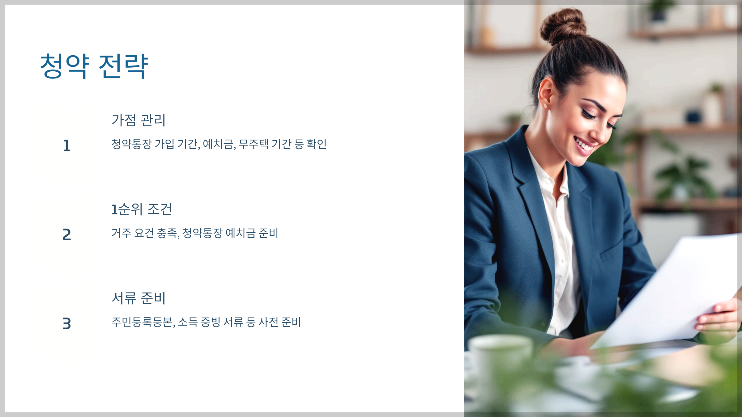 - 청약통장 상태 점검: 가입 기간, 예치금 충족 여부 확인.