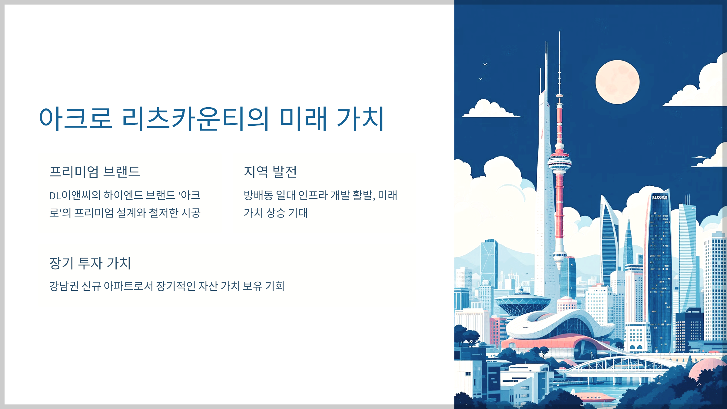아크로 리츠카운티는 단순한 주거공간을 넘어 생활의 품격을 높이는 고급 아파트로 자리 잡을 것입니다. DL이앤씨의 하이엔드 브랜드 '아크로'의 프리미엄 설계와 철저한 시공이 더해져 높은 주거 만족도를 보장합니다. 방배동 일대는 강남권 내 인프라 개발이 활발히 이루어지는 지역으로, 미래 가치 또한 매우 높습니다.