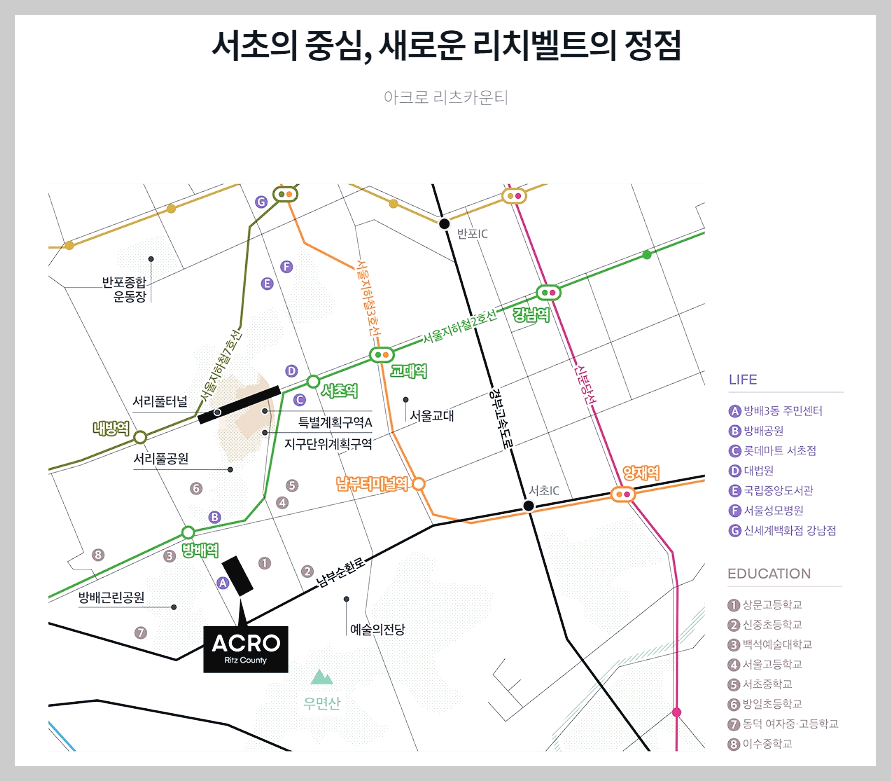 아크로 리츠카운티는 지하철 2호선 방배역에서 도보 7분 거리에 위치하여, 강남역까지 두 정거장 거리로 접근성이 뛰어납니다. 또한, 서리풀공원과 정문공원 등 녹지 공간이 인접해 있어 쾌적한 주거 환경을 제공합니다. 교육 시설로는 방일초등학교가 도보 18분 거리에 있으며, 인근 중학교와 고등학교도 잘 갖춰져 있습니다. 생활 편의시설로는 롯데마트 서초점과 신세계백화점 강남점이 차량으로 10분 이내 거리에 있어 쇼핑과 문화생활을 즐기기 편리합니다.