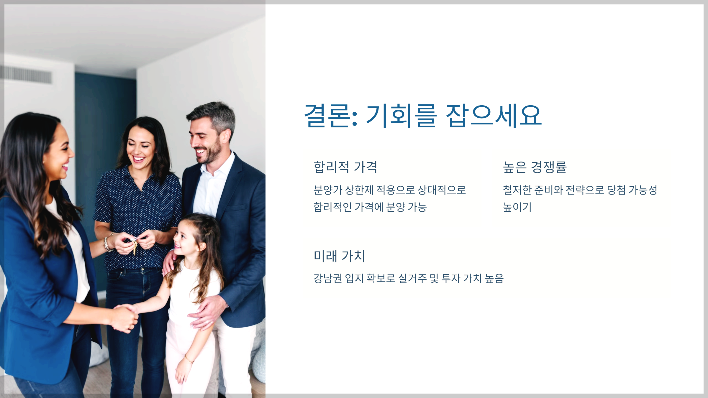 이번 청약은 강남권 신규 아파트를 소유하는 것을 넘어 장기적인 자산 가치를 보유할 기회입니다. 청약 신청을 고민하고 계신다면, 주어진 준비 기간 내 철저히 준비해 후회 없는 결정을 내리시기 바랍니다.