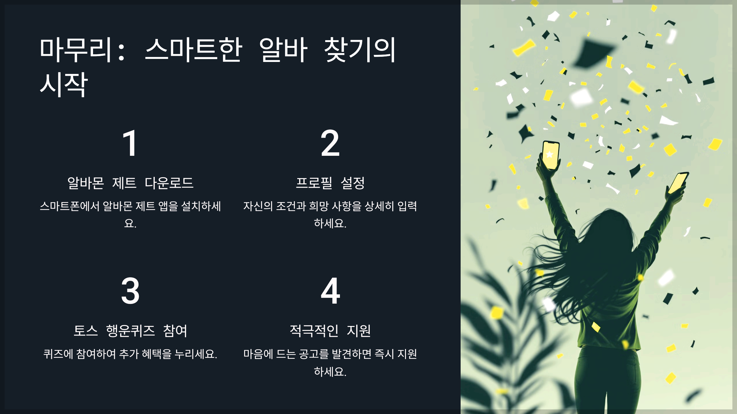 이제 더 막연히 시간과 노력을 허비하지 마시고, 저처럼 알바몬 제트와 토스 행운퀴즈를 적극적으로 활용해 보세요. 원하는 동네 알바를 손쉽게 찾고, 보너스 혜택까지 누리며 효율적이고 풍부한 구직 경험을 쌓으실 수 있을 겁니다. 어려웠던 알바 찾기 과정이 한결 간편해지고, 의미 있게 바뀌는 순간을 직접 경험해 보시기 바랍니다.