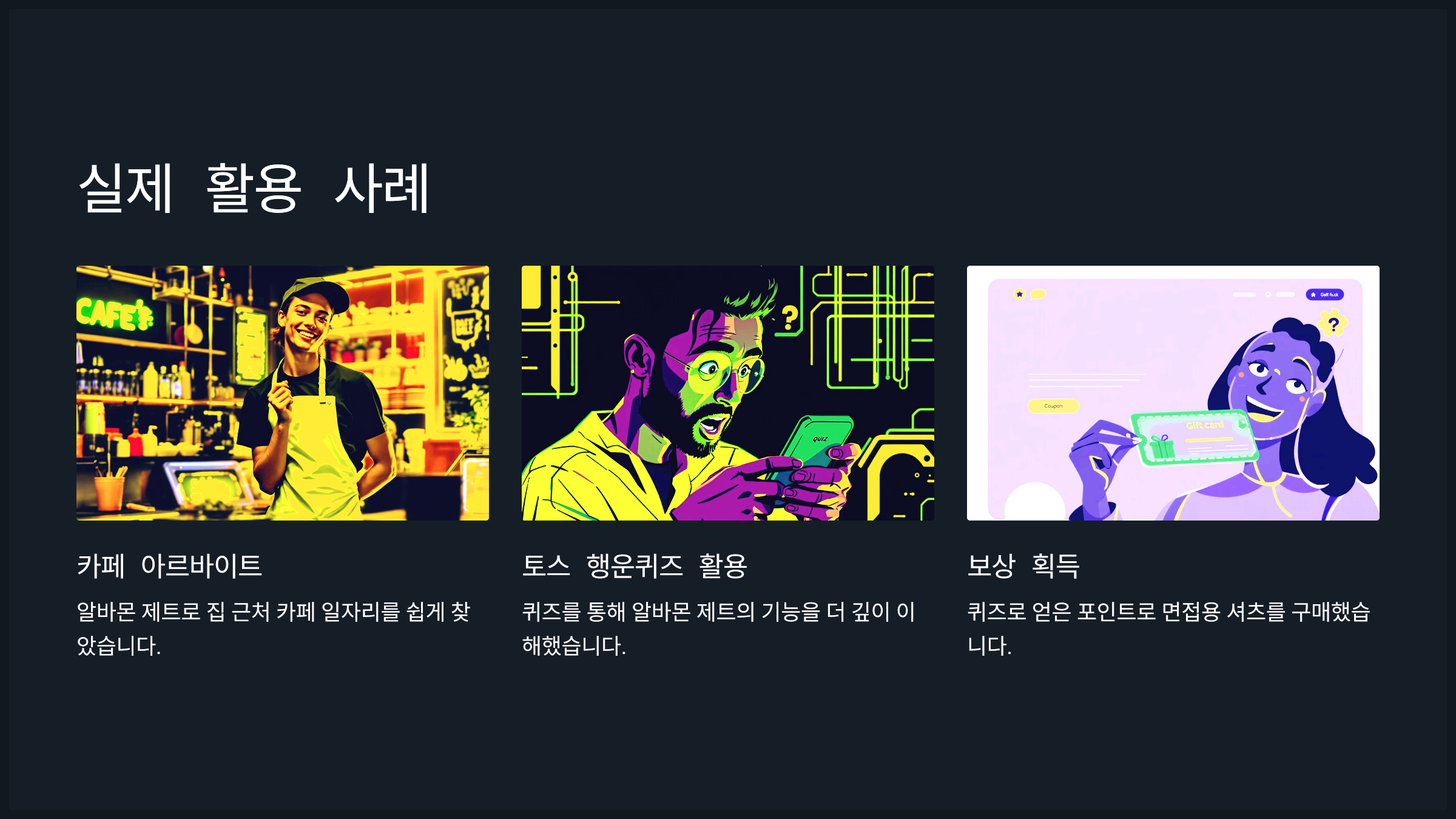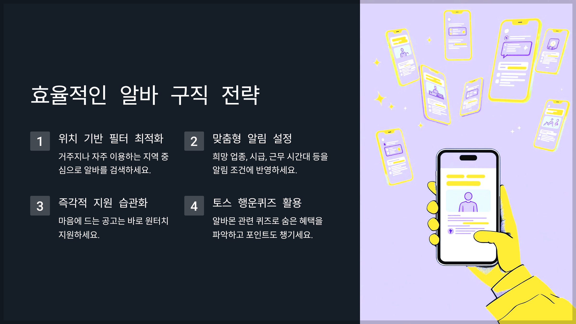 직접 경험해 보니 알바몬 제트와 토스 행운퀴즈를 적절히 결합하면 무의미하게 많은 공고를 뒤지는 수고를 덜고, 효율적이면서도 즐거운 구직 과정을 만들 수 있었습니다. 알바몬 제트의 위치 기반 맞춤 검색과 토스 행운퀴즈의 정보 및 보상 제공 기능은 서로 보완 관계에 있어, 알바 구하기가 더 막막하게만 느껴지지 않았습니다.