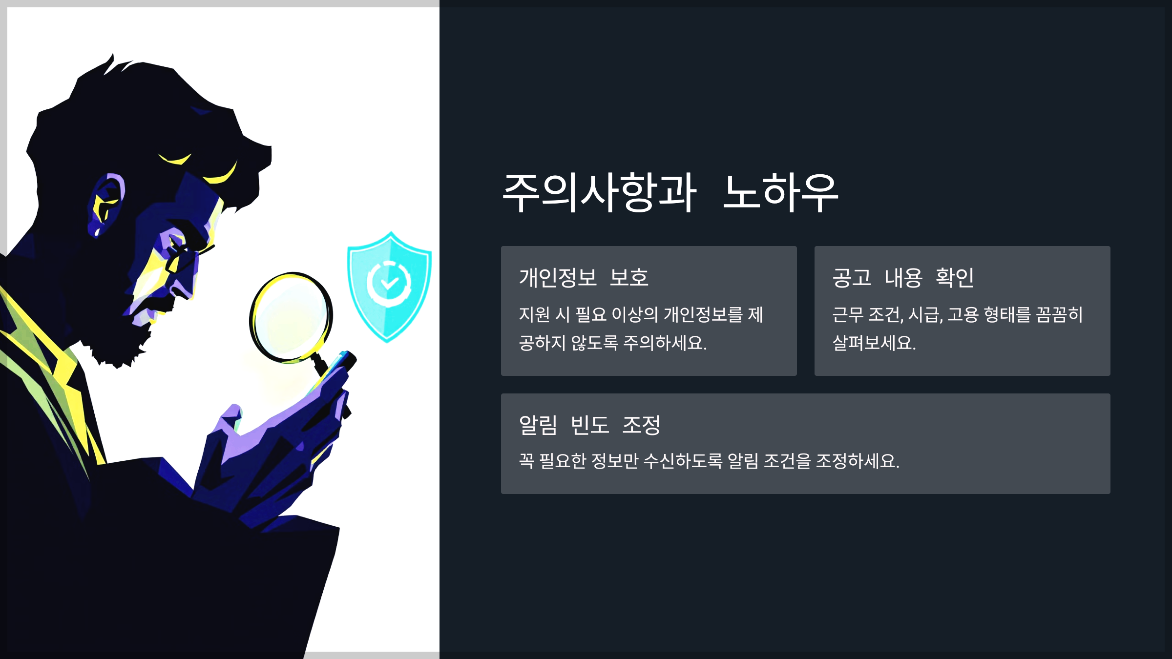 • 즉각적 지원 습관화: 인기 있는 공고는 빨리 마감될 수 있으니 마음에 드는 공고는 바로 원터치 지원하세요.