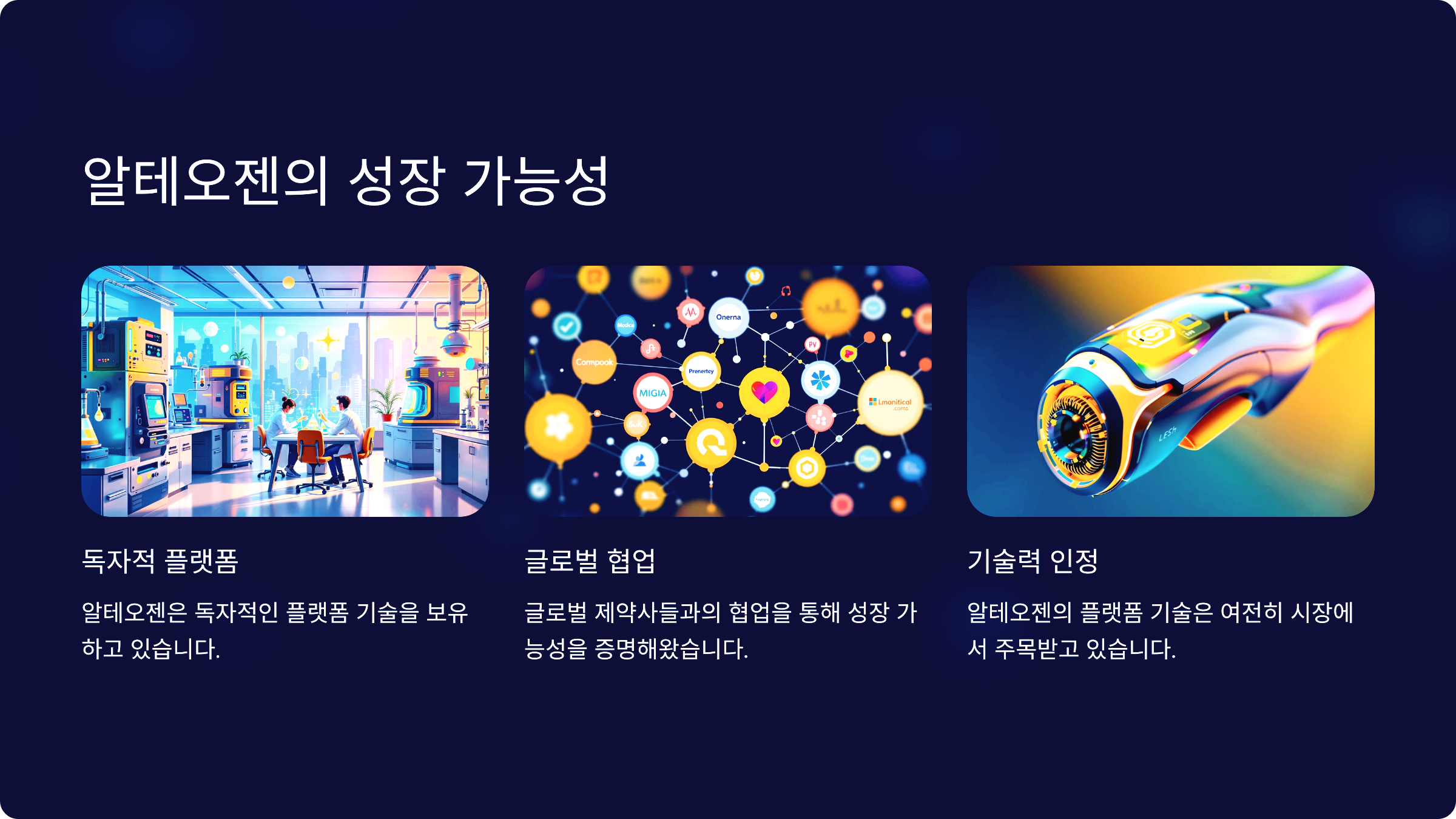 알테오젠은 독자적인 플랫폼 기술과 글로벌 제약사들과의 협업을 통해 성장 가능성을 꾸준히 증명해왔습니다. 특히 그들의 플랫폼 기술은 여전히 시장에서 주목받고 있으며, 장기적인 관점에서 볼 때 기업의 기술력과 성장 가능성은 매우 매력적입니다. 최근 주가 하락에도 불구하고, 이들의 핵심 기술에 대한 시장의 관심과 협업의 확대 가능성은 긍정적인 신호라고 할 수 있습니다.