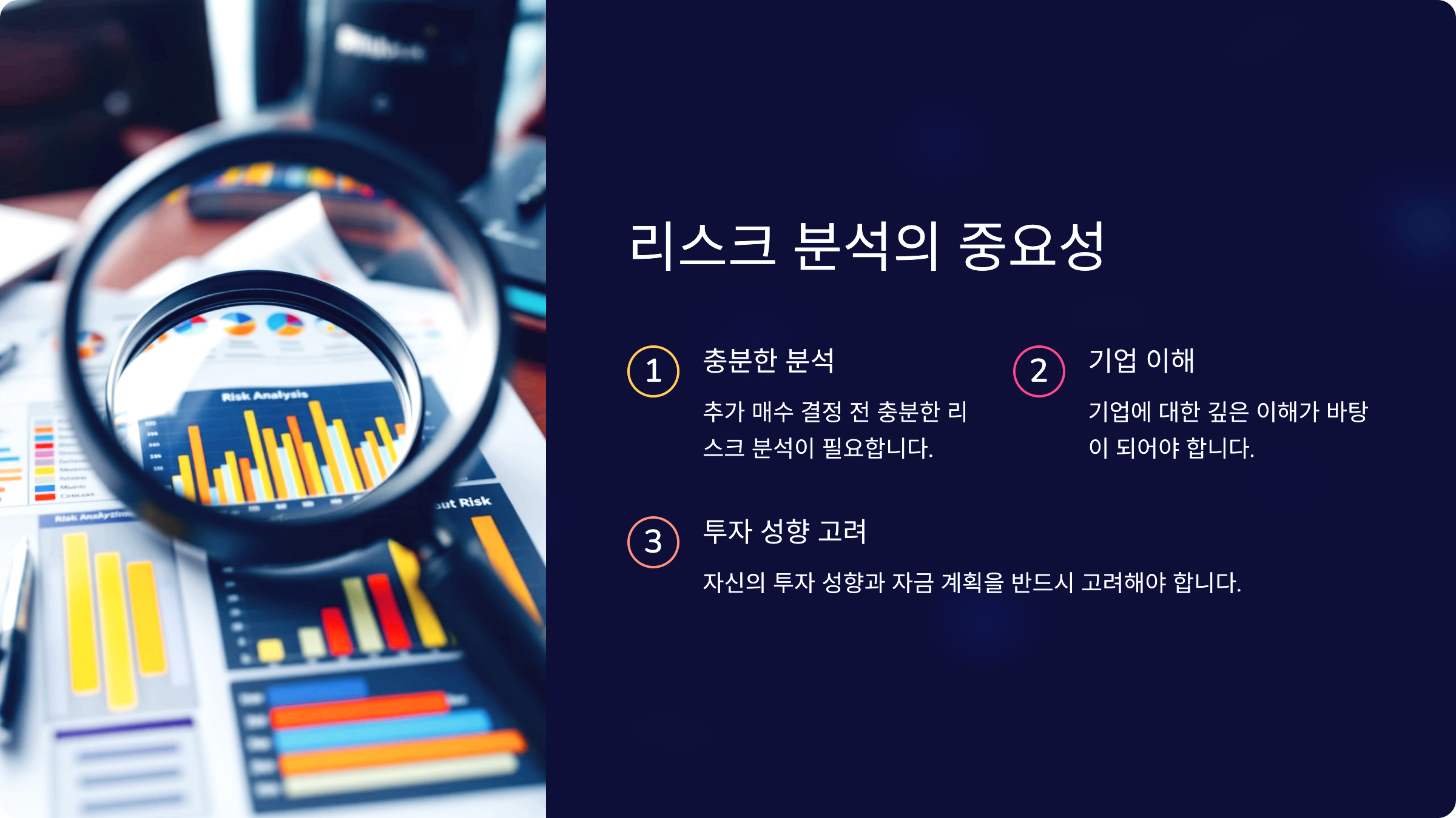 주가가 하락했을 때 추가 매수를 고려할 수도 있습니다. 기술에 대한 확신이 있다면, 시장의 일시적인 반응을 기회로 삼아 저평가된 주식을 매입하는 전략을 취할 수 있습니다. 물론 이러한 결정은 충분한 리스크 분석과 기업에 대한 깊은 이해가 바탕이 되어야 하며, 자신의 투자 성향과 자금 계획도 반드시 고려해야 합니다.
