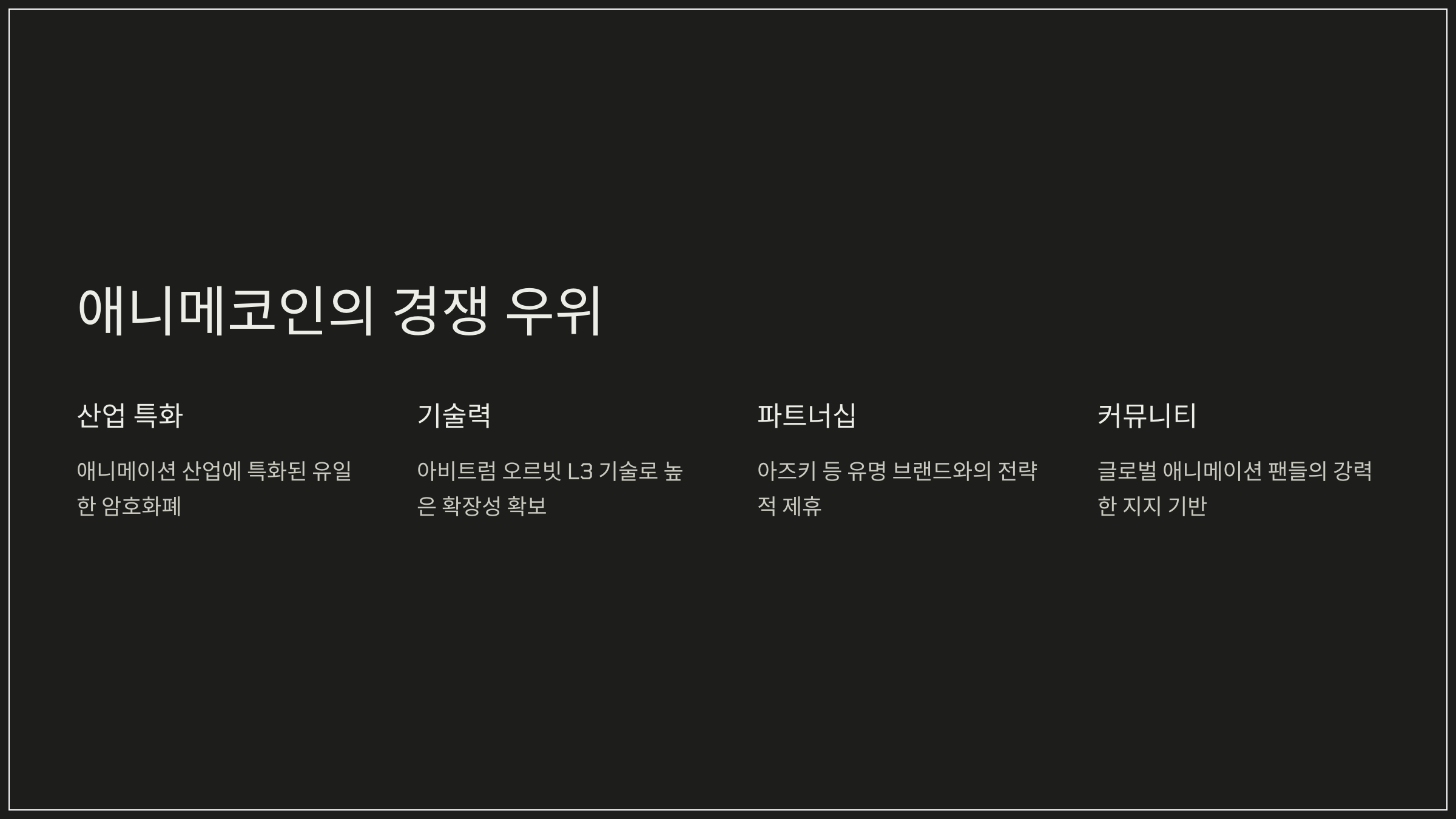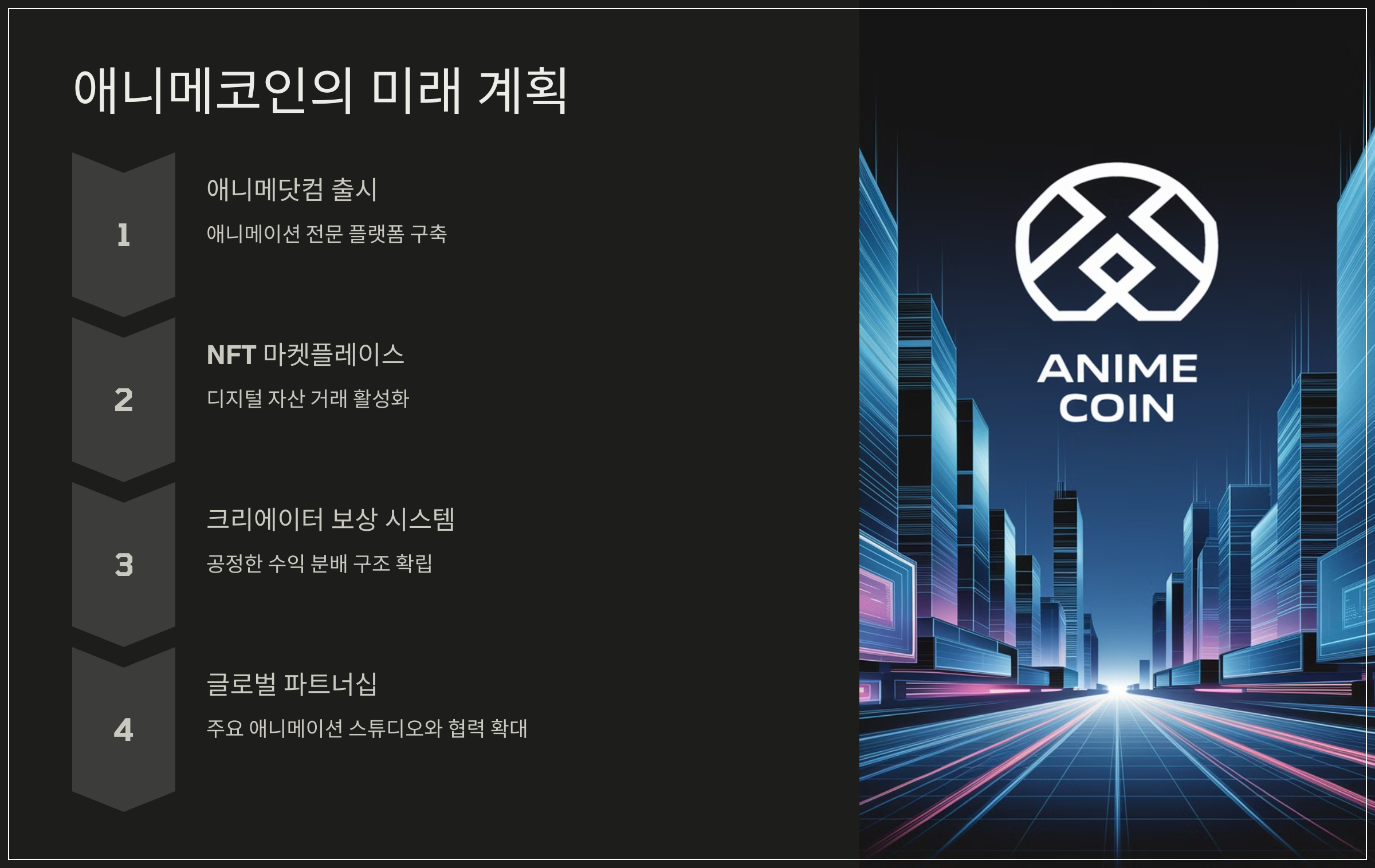 애니메코인은 향후 아래와 같은 주요 계획을 통해 애니메이션 시장 내 입지를 강화할 예정이다.