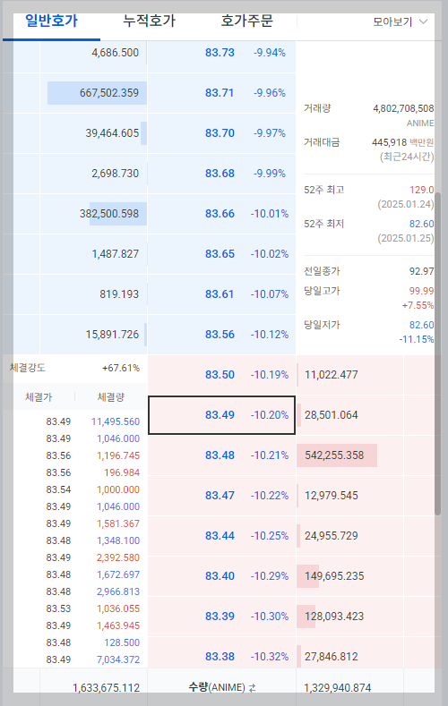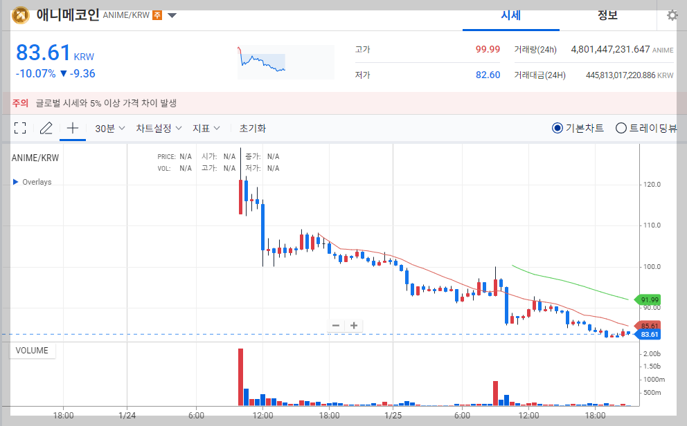 상장 이후 애니메 코인은 1월 25일 기준 약 101.8원으로 거래되며 초기 가격 대비 약 9% 하락했다. 이런 변동성은 새로운 코인의 상장 초기 단계에서 자주 나타나며, 장기적인 안정화를 기다리는 것이 중요하다.