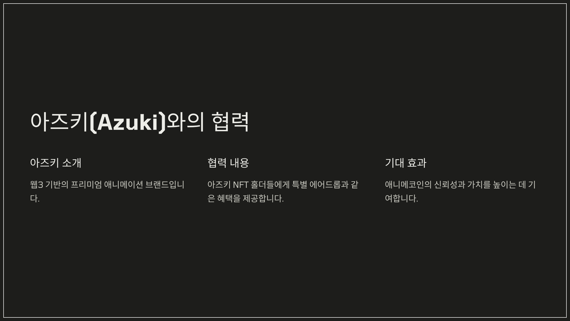 아즈키는 웹 3 기반의 프리미엄 애니메이션 브랜드로, 애니메코인의 생태계 발전에 깊이 관여하고 있다.