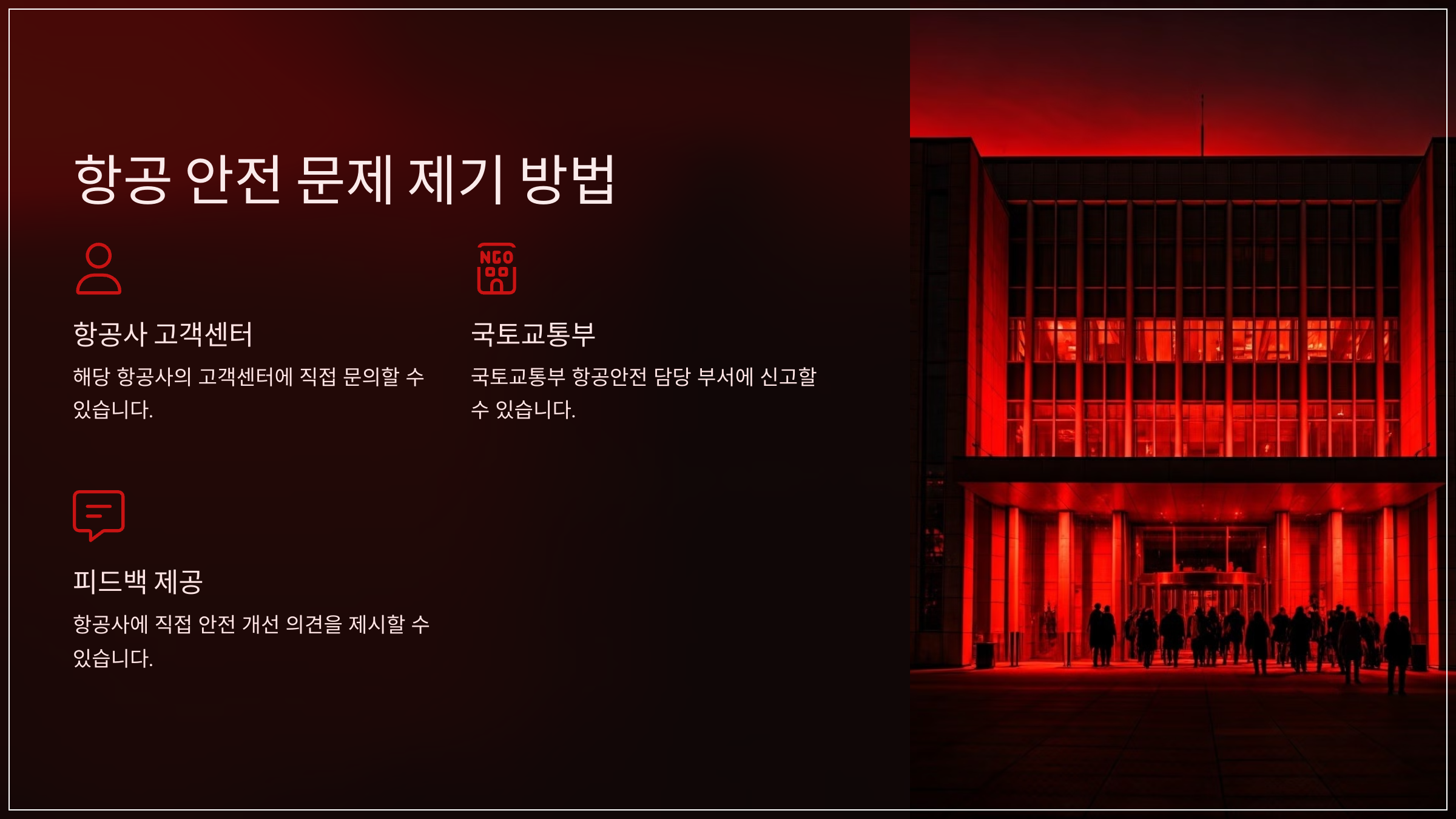 - 승객 역시 비행 전 안전 수칙과 비상구 위치를 숙지하는 습관을 들이는 것이 중요하다.