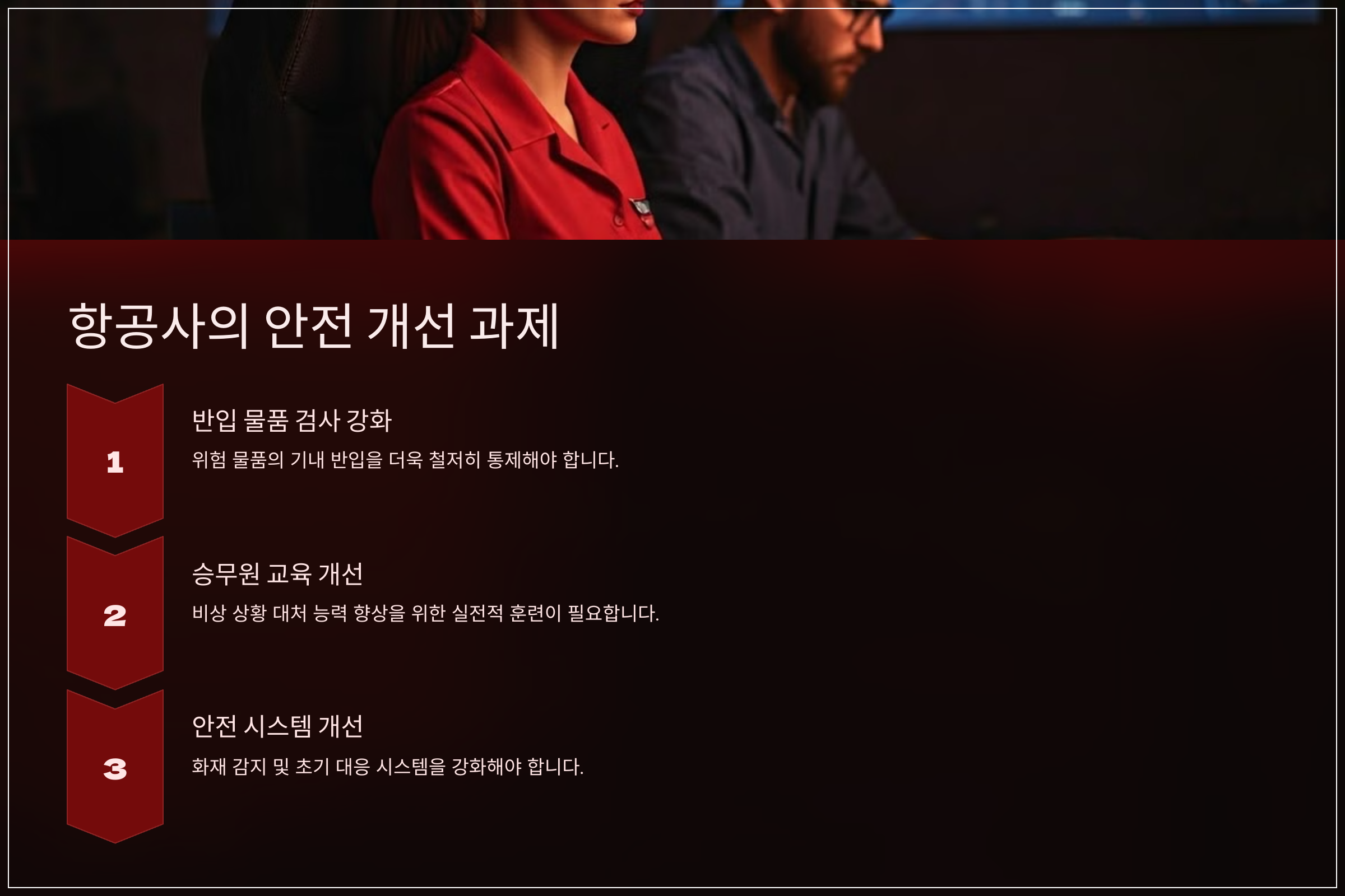 - 항공사 측에서는 기내 반입 물품 검사를 강화하고, 비상 상황에 대비한 승무원 훈련을 철저히 해야 한다.
