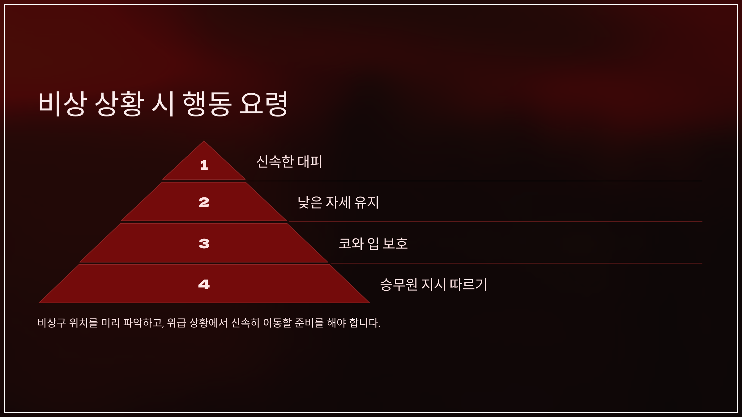 - 승무원의 지시를 따르되, 안내가 부족할 경우 주변 상황을 신속히 판단해 대피해야 한다.