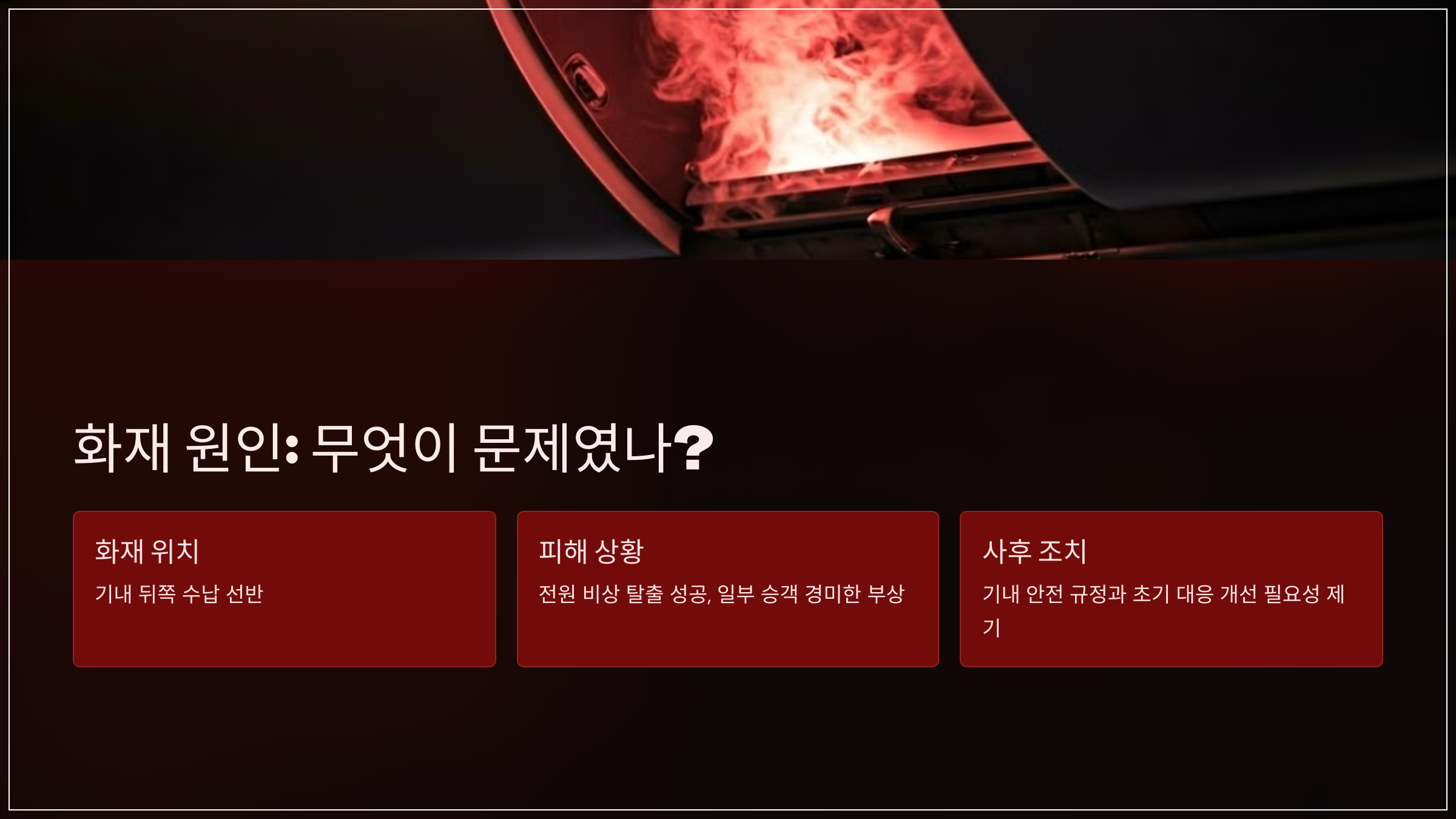 특히 기내 수납 선반은 공기 순환 장치와 연결되어 있어 연기와 불길이 빠르게 확산될 위험이 크다. 이런 구조적 특성이 초기 화재 대응을 더욱 어렵게 만들 수 있다.