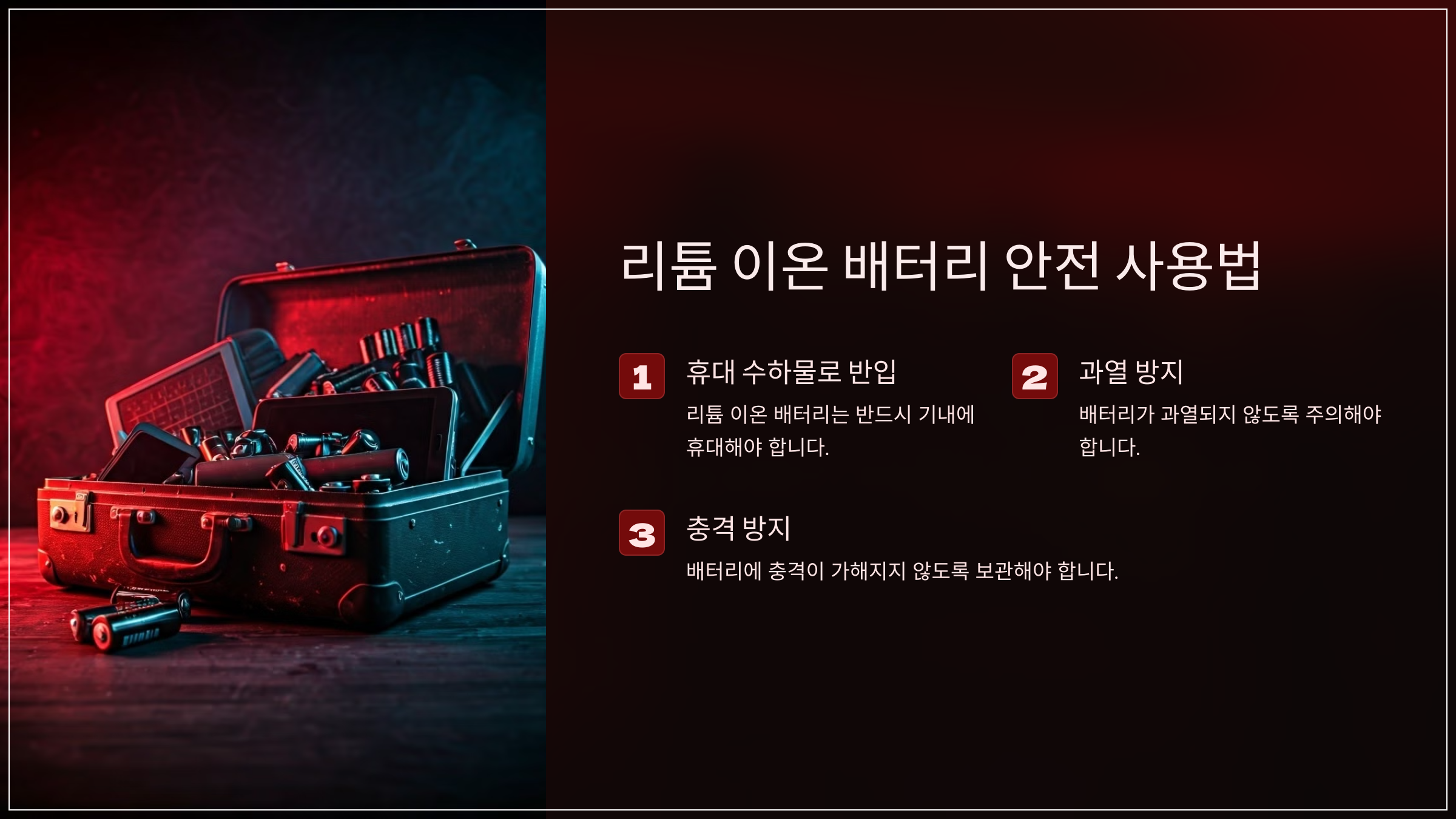 - 리튬 이온 배터리 등 발화 위험이 있는 물품은 반드시 규정에 맞게 보관해야 한다.