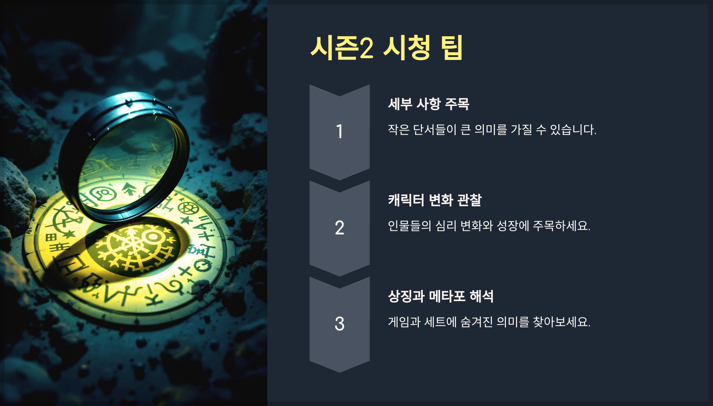 시즌2에서 가장 기대되는 것은 역시 게임입니다. 시즌1에서 '무궁화 꽃이 피었습니다' 같은 어린 시절 놀이가 극도로 긴장감 넘치는 생존 게임으로 변모했죠. 이번 시즌에서는 비석치기, 얼음 땡, 고무줄놀이 같은 전통 놀이가 현대적으로 재해석될 가능성이 큽니다. 이런 게임들이 어떻게 극적인 장치로 변할지 정말 기대됩니다.