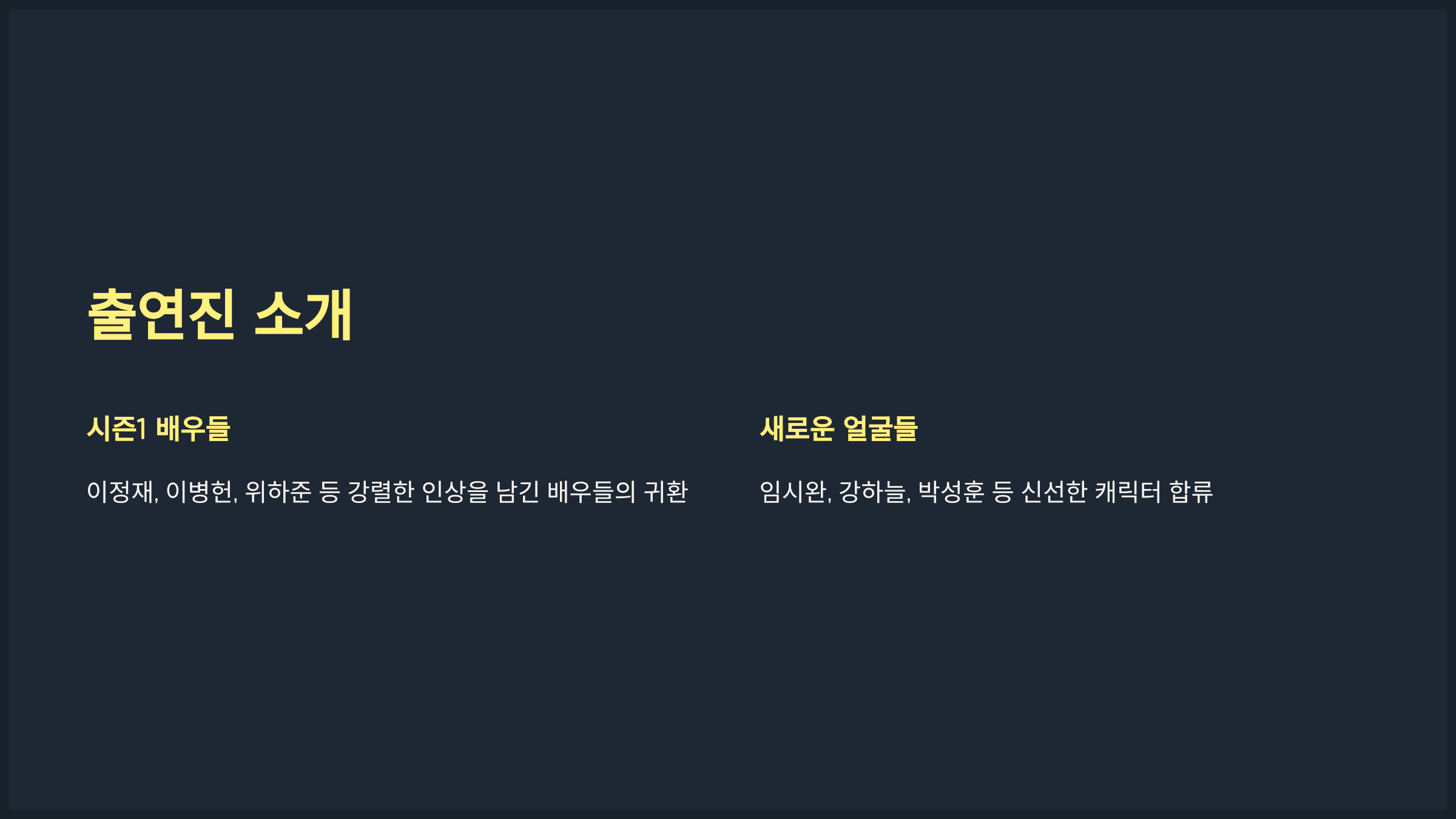 이정재, 이병헌, 위하준 등 시즌1에서 강렬한 인상을 남겼던 배우들이 다시 돌아옵니다. 그리고 임시완, 강하늘, 박성훈 같은 새로운 배우들도 합류했어요. 개인적으로 임시완의 차가운 카리스마가 기대됩니다. 새로운 캐릭터들이 기존 인물들과 어떤 관계를 만들어갈지도 흥미로운 관전 포인트가 될 것 같아요.