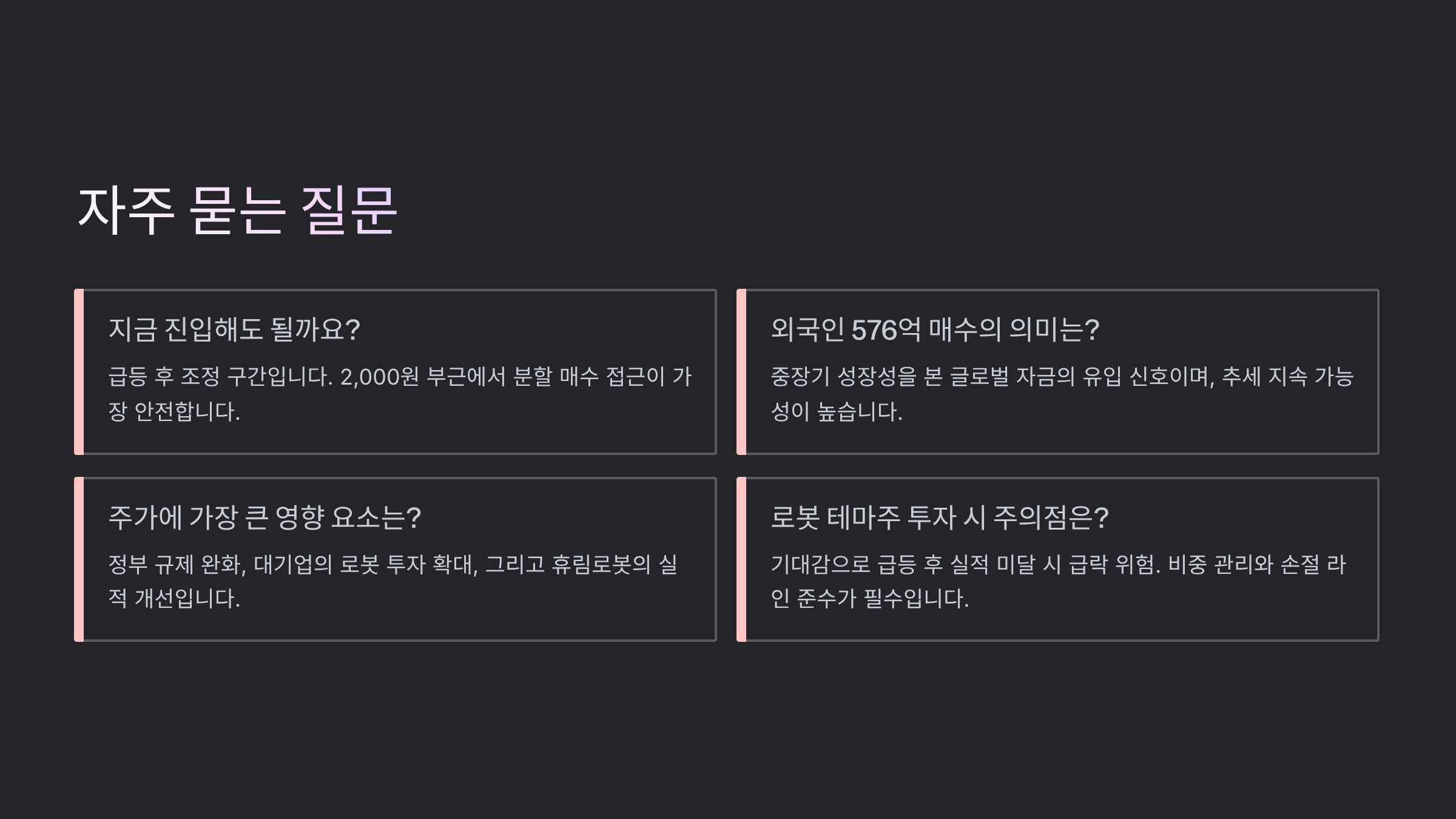 지금까지 올해 131% 급등한 주식, 외국인 576억 매수한 휴림로봇 주가 패턴과 향후 투자 전략 분석에 대해 알아봤습니다. 휴림로봇의 131% 급등은 단순한 주가 이벤트가 아닙니다.