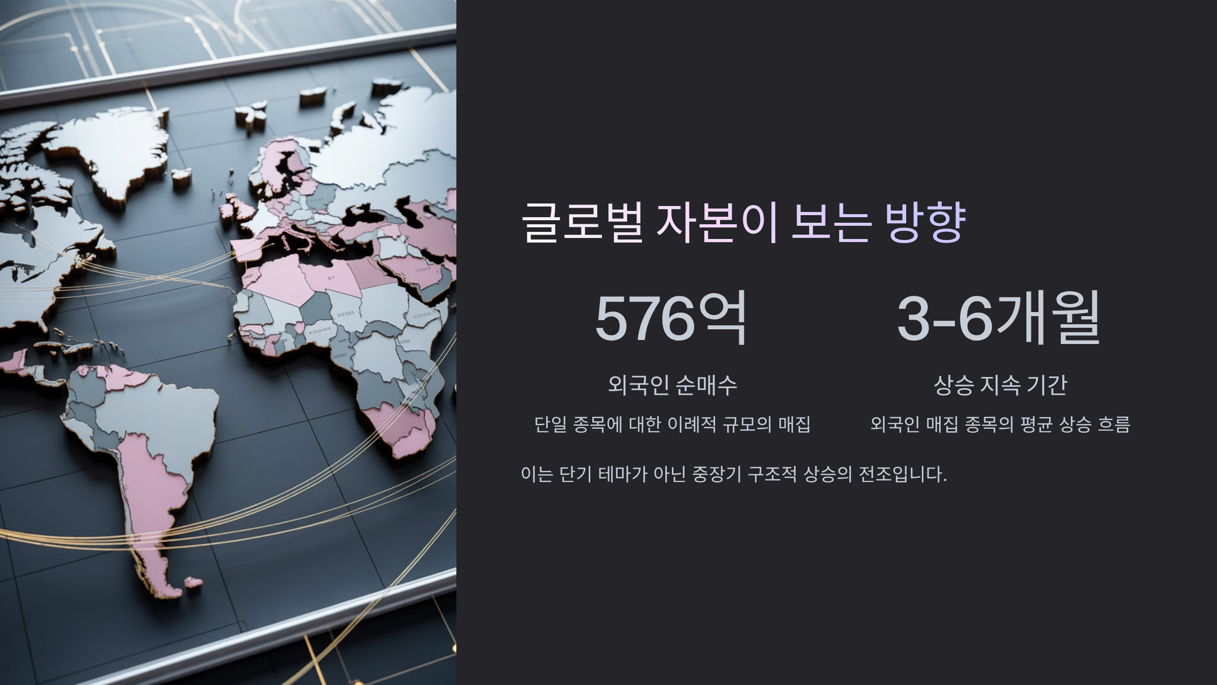 외국인 투자자들이 단일 종목에 576억 원을 순매수한 건 이례적입니다. 그들은 단기 시세보다 산업의 방향성과 성장성을 보고 움직입니다.