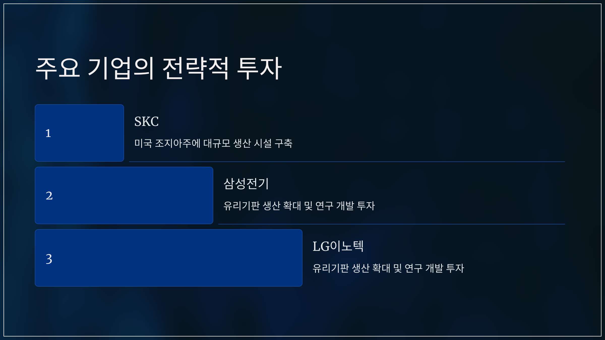 - 삼성전기 및 LG이노텍: 유리기판 생산 확대 및 연구 개발에 적극 투자하고 있다.