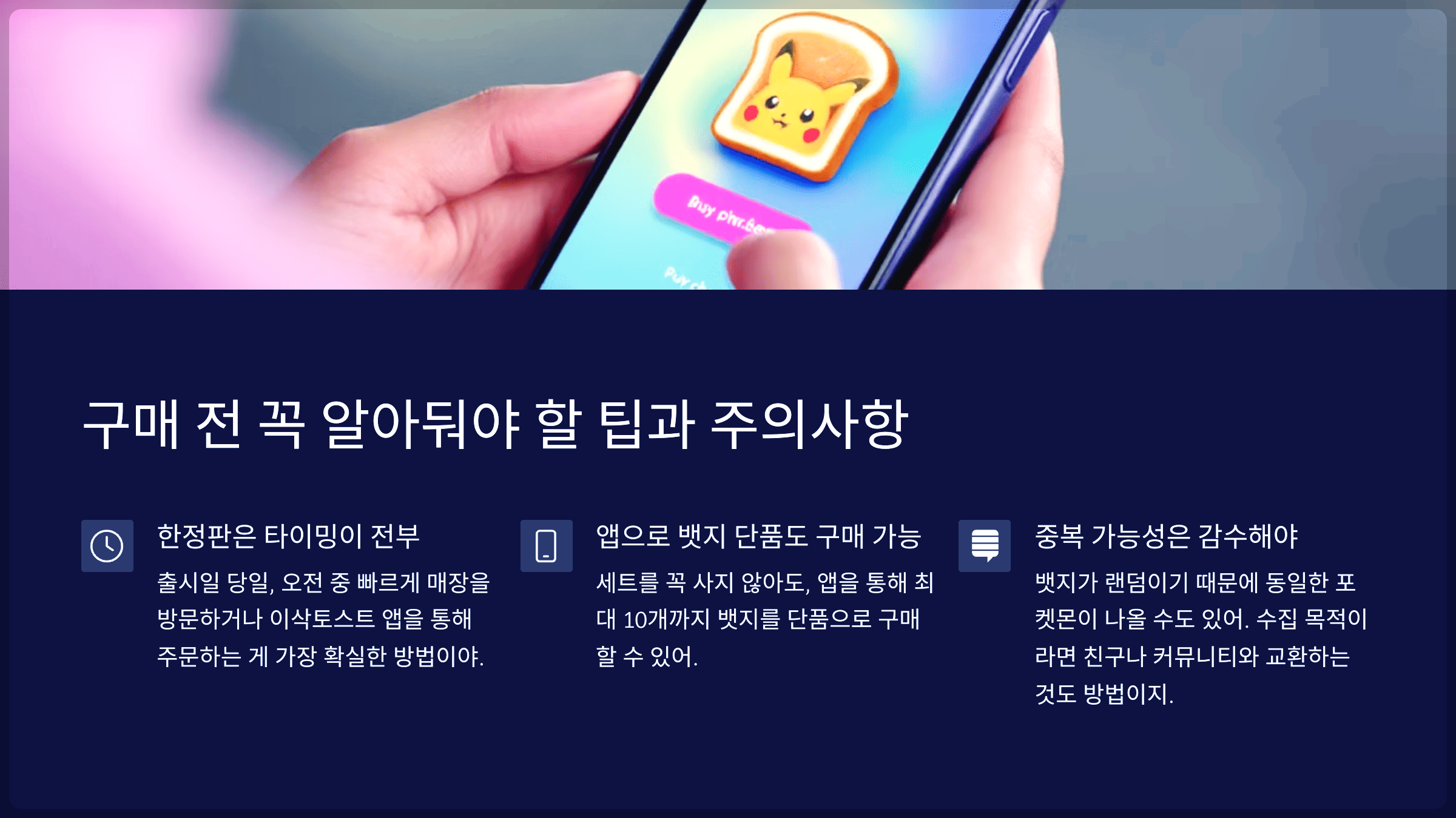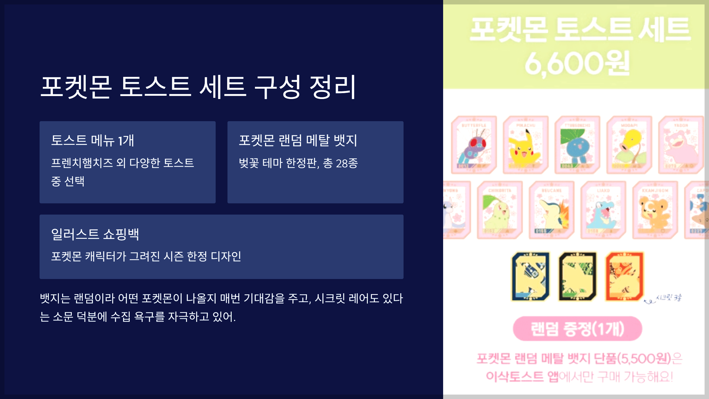 포켓몬 토스트 세트는 그 자체로 식사의 즐거움, 굿즈의 소장욕, 추억의 감성을 한 번에 만족시켜 줘. 특히 시즌 한정으로 출시되기에 더 놓치기 아까운 기회야.