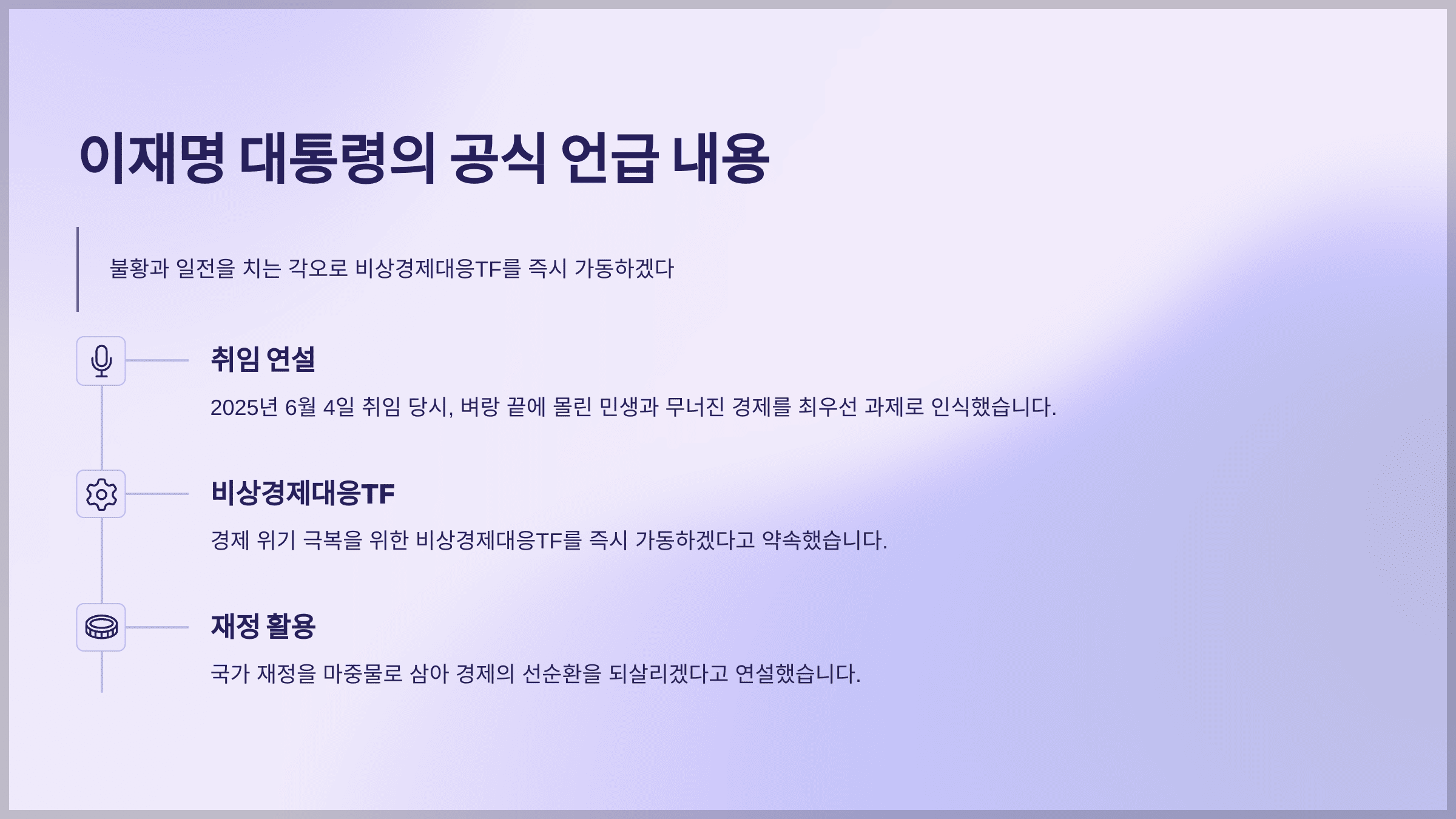 2025년 6월 4일 취임 당시, 이재명 대통령은 *벼랑 끝에 몰린 민생과 무너진 경제를 최우선 과제로 인식하고 "불황과 일전을 치는 각오로 비상경제대응 TF를 즉시 가동하겠다"라고 하셨습니다.