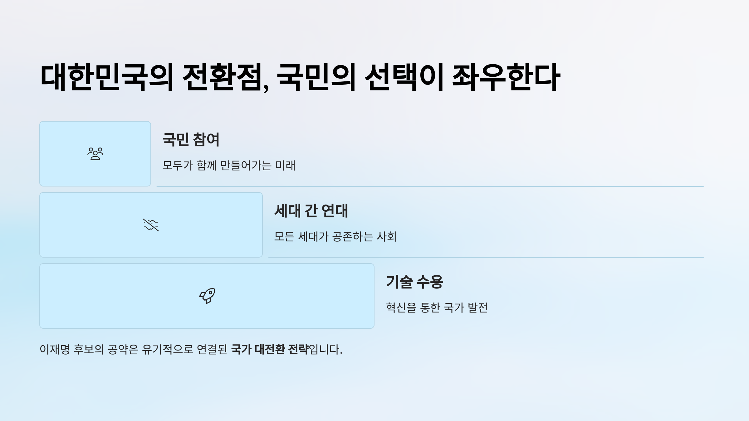 지금까지 이재명 후보 공약, 경제·복지·정치·안보·무역으로 보는 미래 비전을 알아봤습니다. 이재명 후보의 공약은 단순한 공약의 나열이 아니라, 유기적으로 연결된 국가 대전환 전략입니다. 국민 참여, 세대 간 연대, 기술 수용이라는 실천 요소가 뒷받침될 때 실현 가능성이 높아집니다.