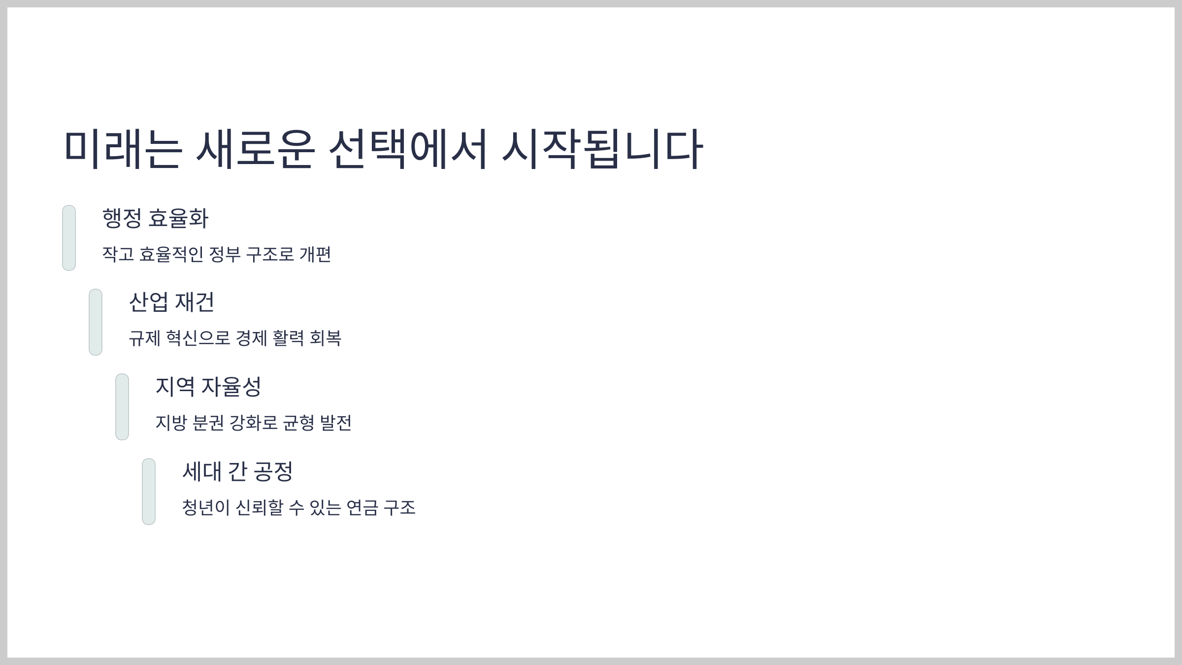 ⚙️ 이준석 후보 정부 구조 개혁, 경제, 지방 분권 강화, 연금개혁, 보건, 청년과 과학기술, 교육 및 국방