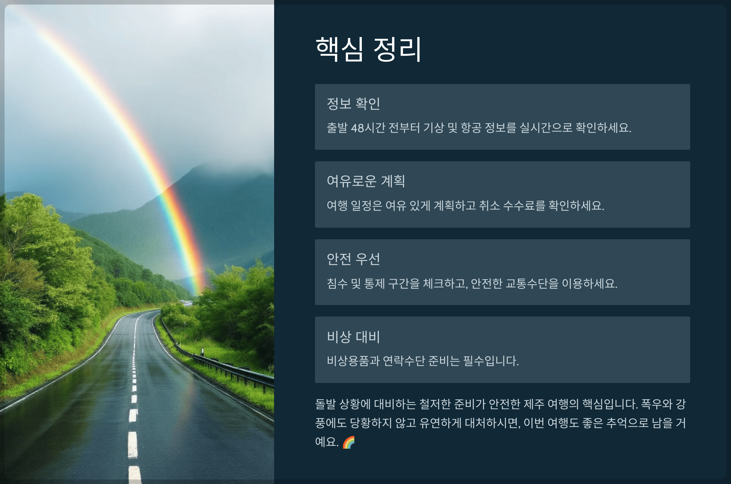 돌발 상황에 대비하는 철저한 준비가 안전한 제주 여행의 핵심입니다. 폭우와 강풍에도 당황하지 않고 유연하게 대처하시면, 이번 여행도 좋은 추억으로 남을 거예요. 🌈