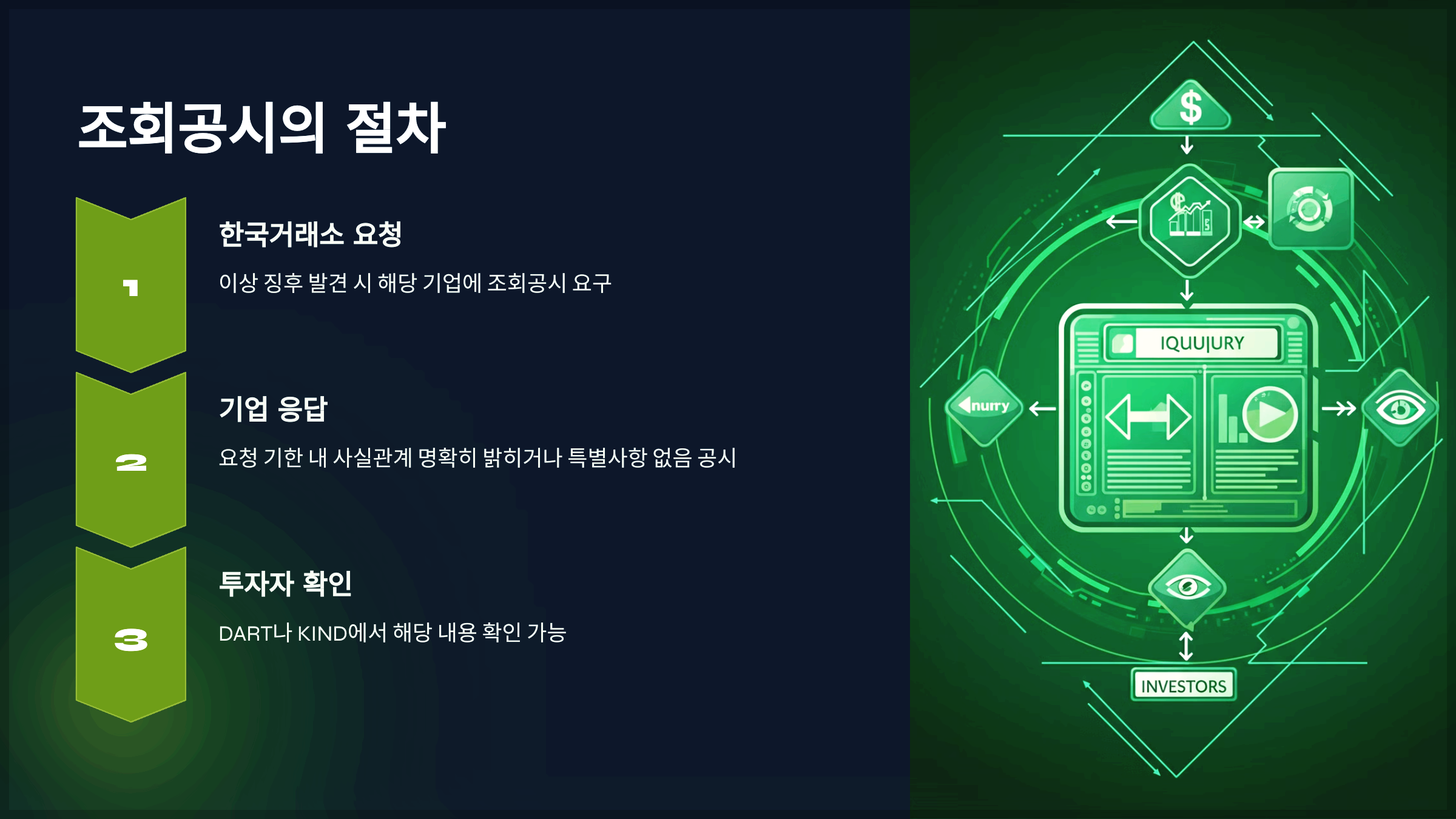 • 한국거래소 요청: 이상 징후가 발견되면 한국거래소는 해당 기업에 조회공시를 요구합니다.