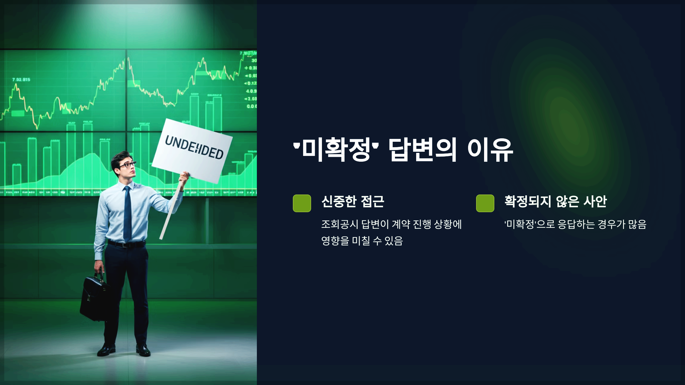 • A2: 기업 입장에서 조회공시의 답변이 계약 진행 상황에 영향을 미칠 수 있어 신중해야 합니다. 따라서 확정되지 않은 사안에 대해서는 '미확정'으로 응답하는 경우가 많습니다.