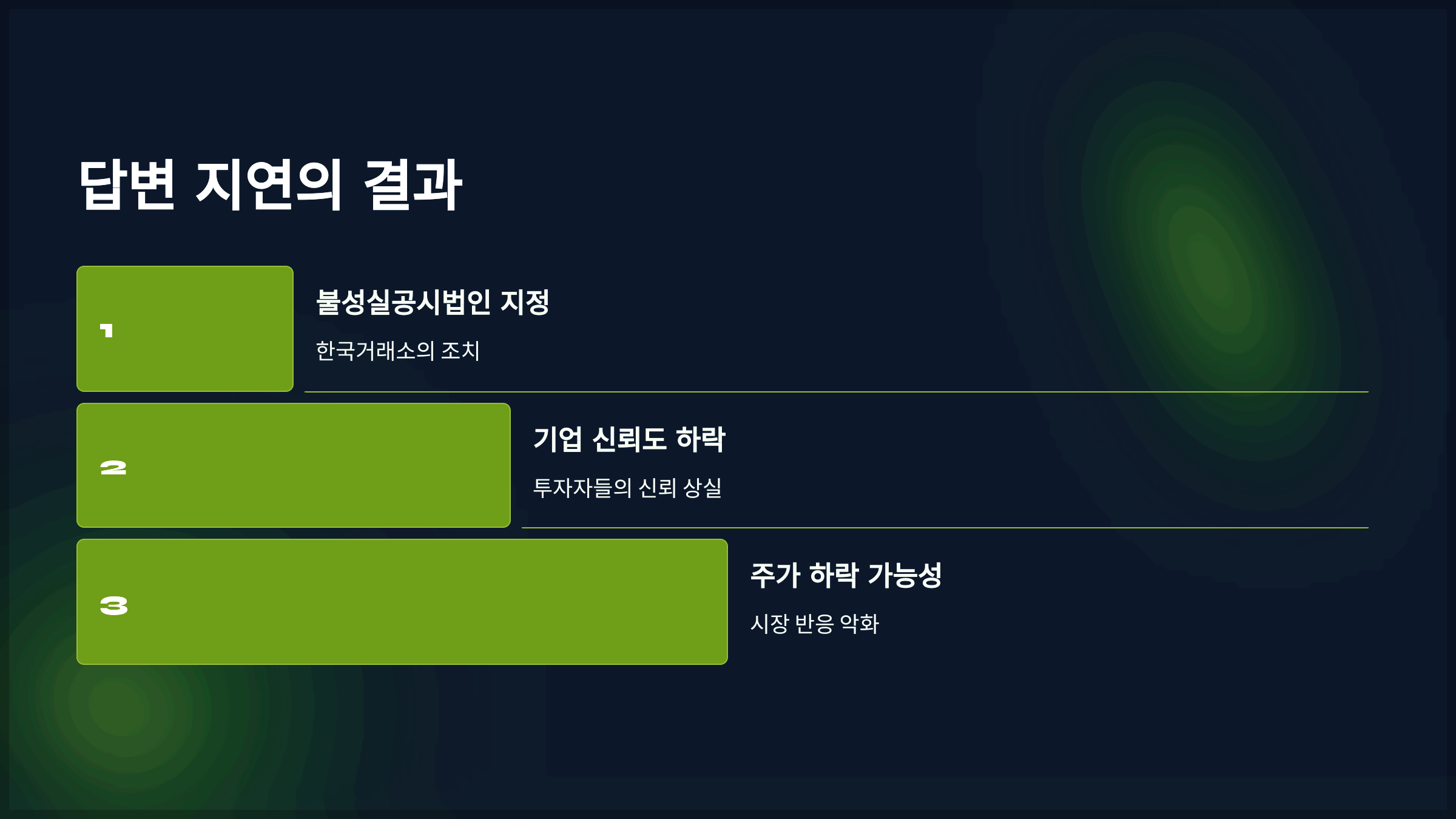 • 만약 기업이 조회공시 요구에 성실히 응답하지 않으면 '불성실공시법인'으로 지정될 수 있습니다. 이는 기업 신뢰도에 심각한 타격을 주며, 주가 하락으로 이어질 수 있습니다.