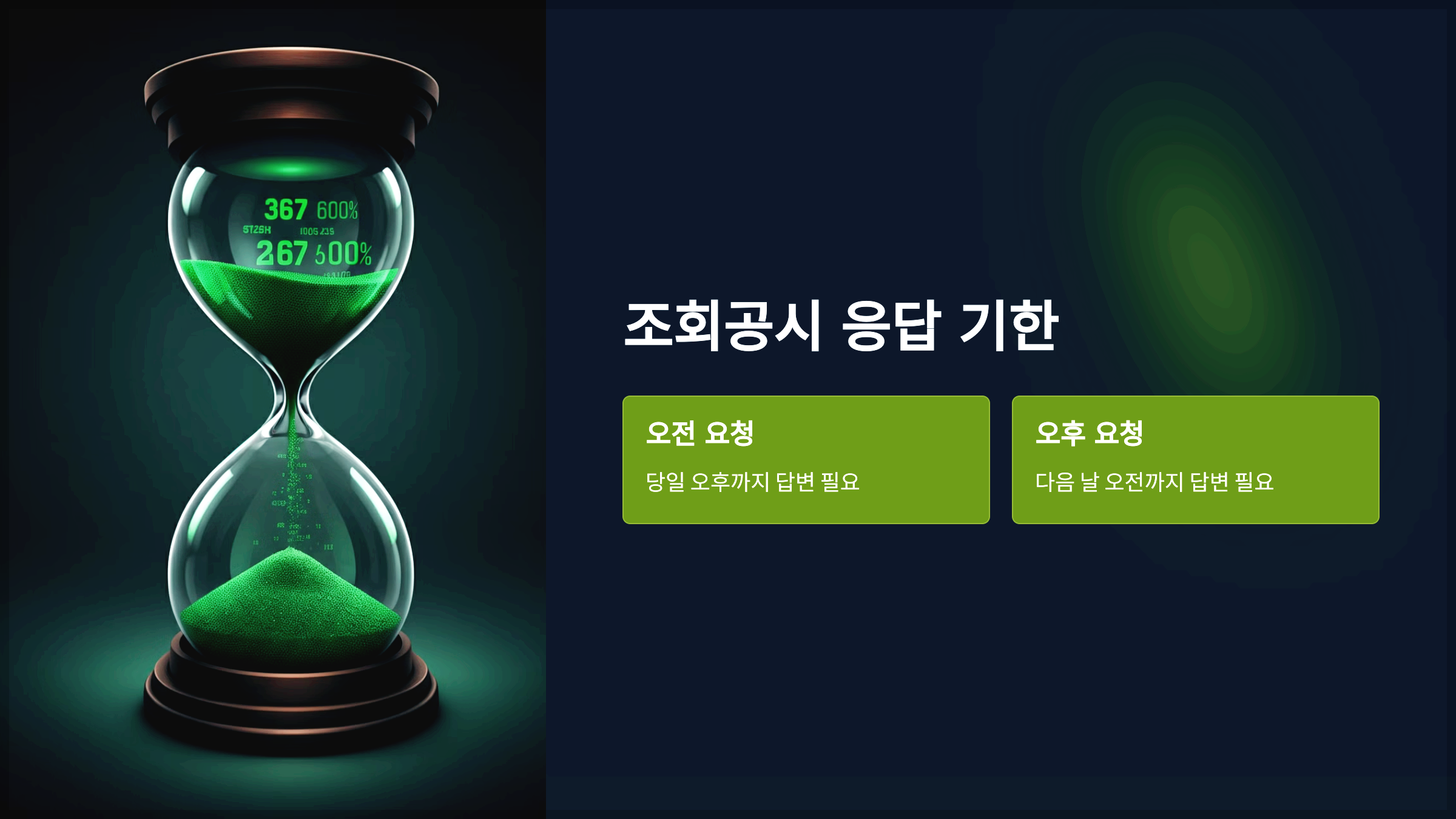 • 일반적으로 공시 요청이 오전에 이루어진 경우 당일 오후까지, 오후에 이루어진 경우 다음 날 오전까지 답변해야 합니다.