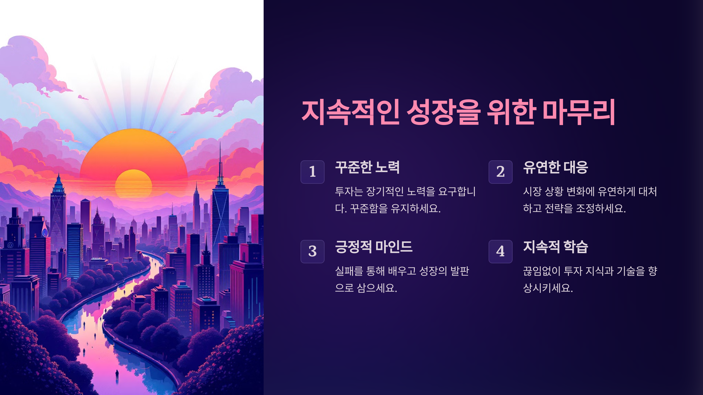 투자는 장기적 목표를 가지고 끊임없이 개선하는 과정입니다. 이 글이 여러분의 투자 여정에 실질적인 도움이 되기를 바랍니다. 꾸준히 노력한다면, 성공은 여러분의 것입니다.