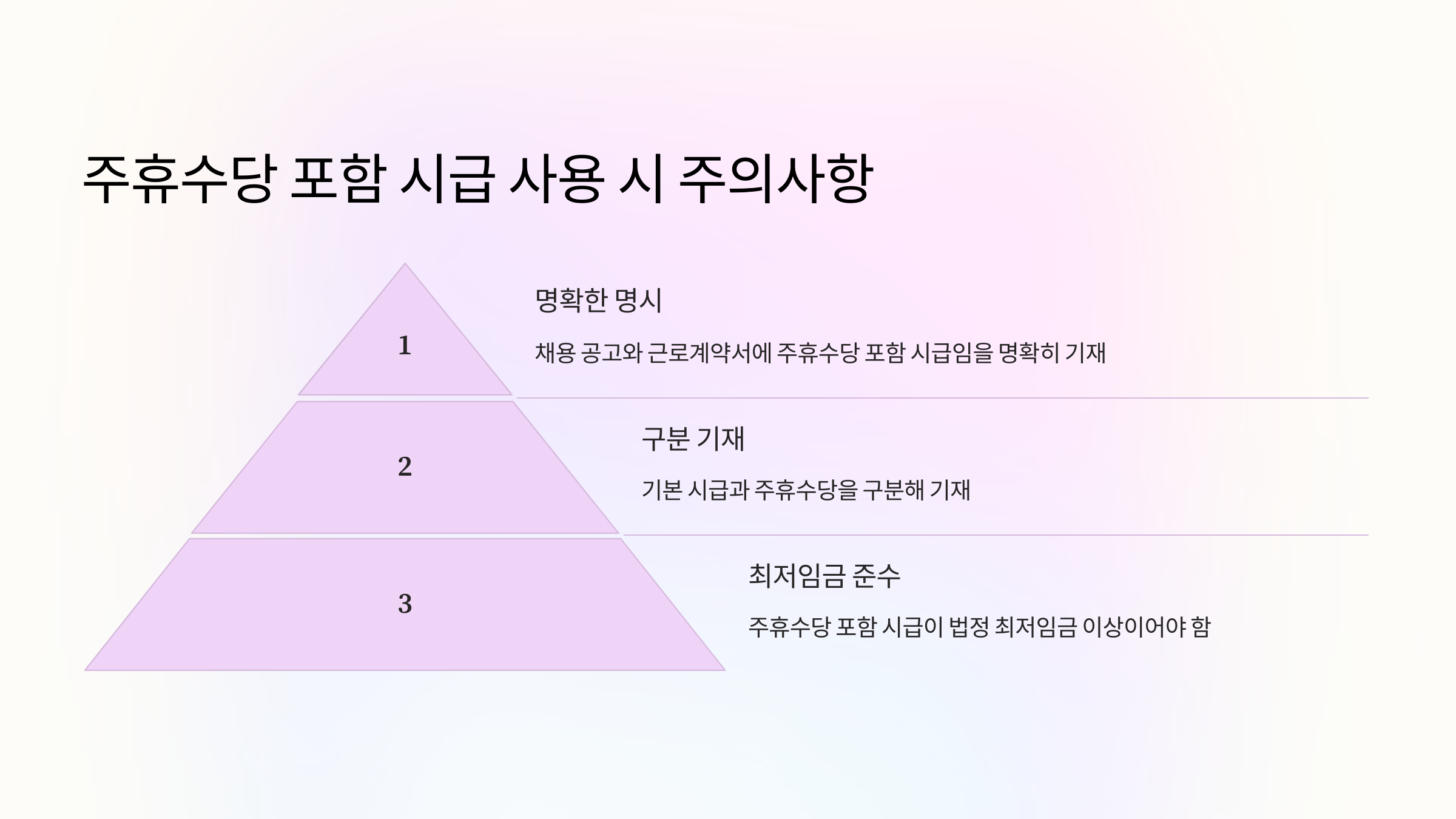 • 계산의 복잡성 고려: 결근 시 주휴수당을 재계산해야 하므로 복잡할 수 있고, 잘못된 계산으로 불필요한 분쟁이 생길 수 있어요.