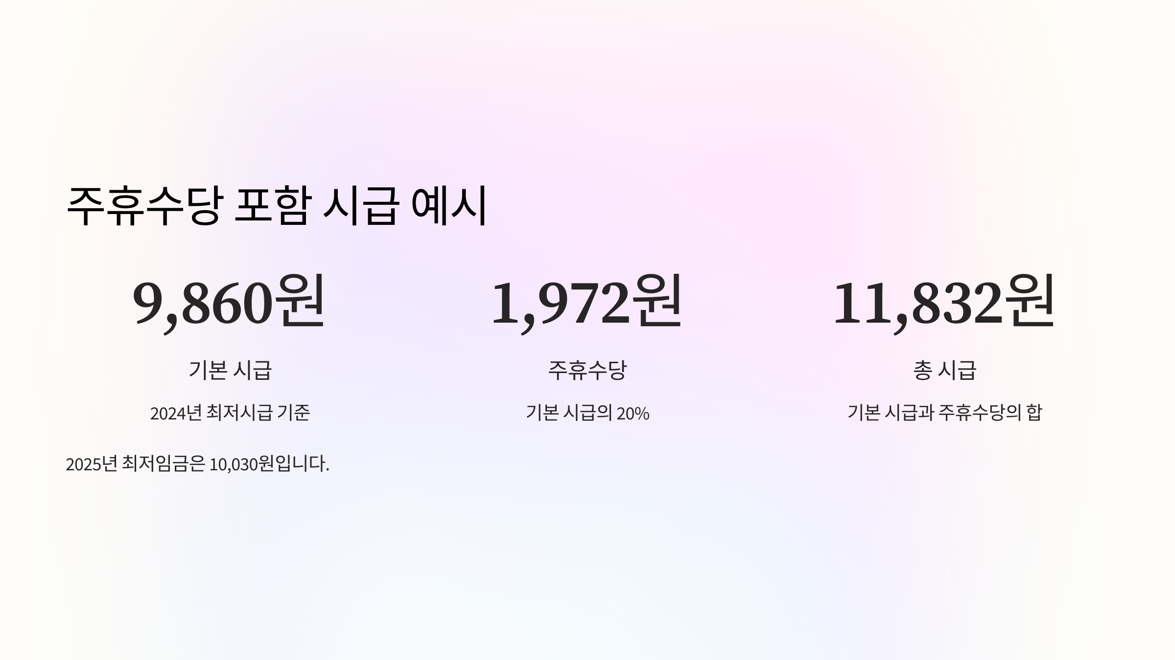 • 예: '기본 시급 9,860원 + 주휴수당 1,972원 = 총 시급 11,832원(2024년 최저시급 기준)'