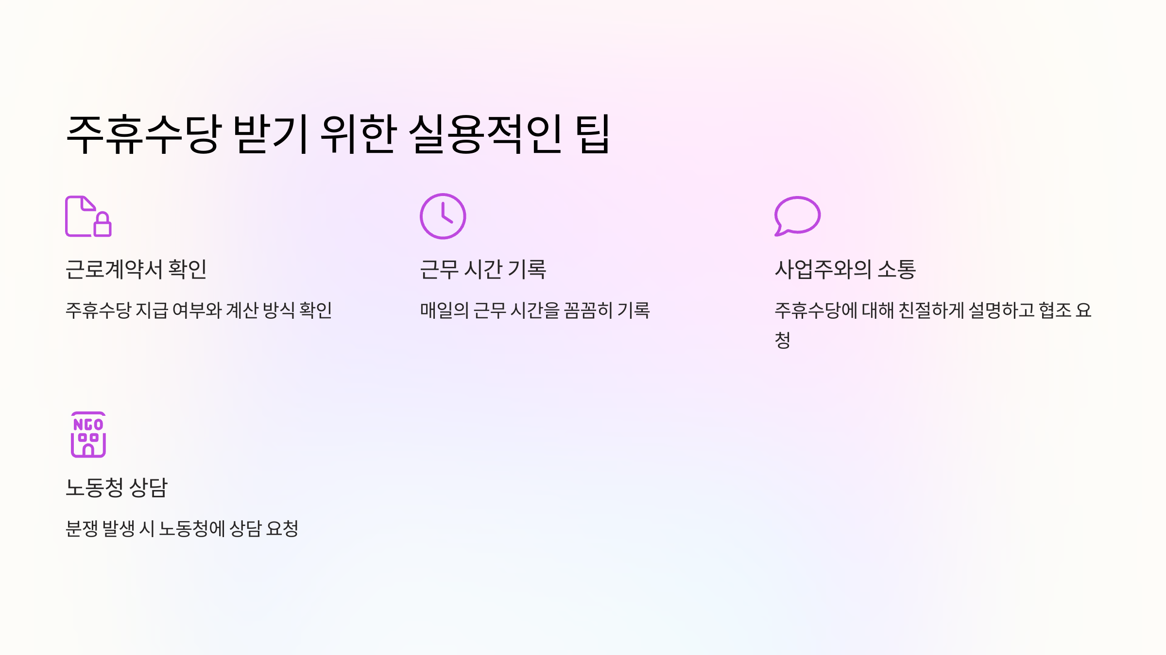 • 사업주와의 소통: 주휴수당에 대해 모르는 사업주도 많아요. 이럴 때는 친절하게 설명하고 협조를 요청하는 게 좋아요.